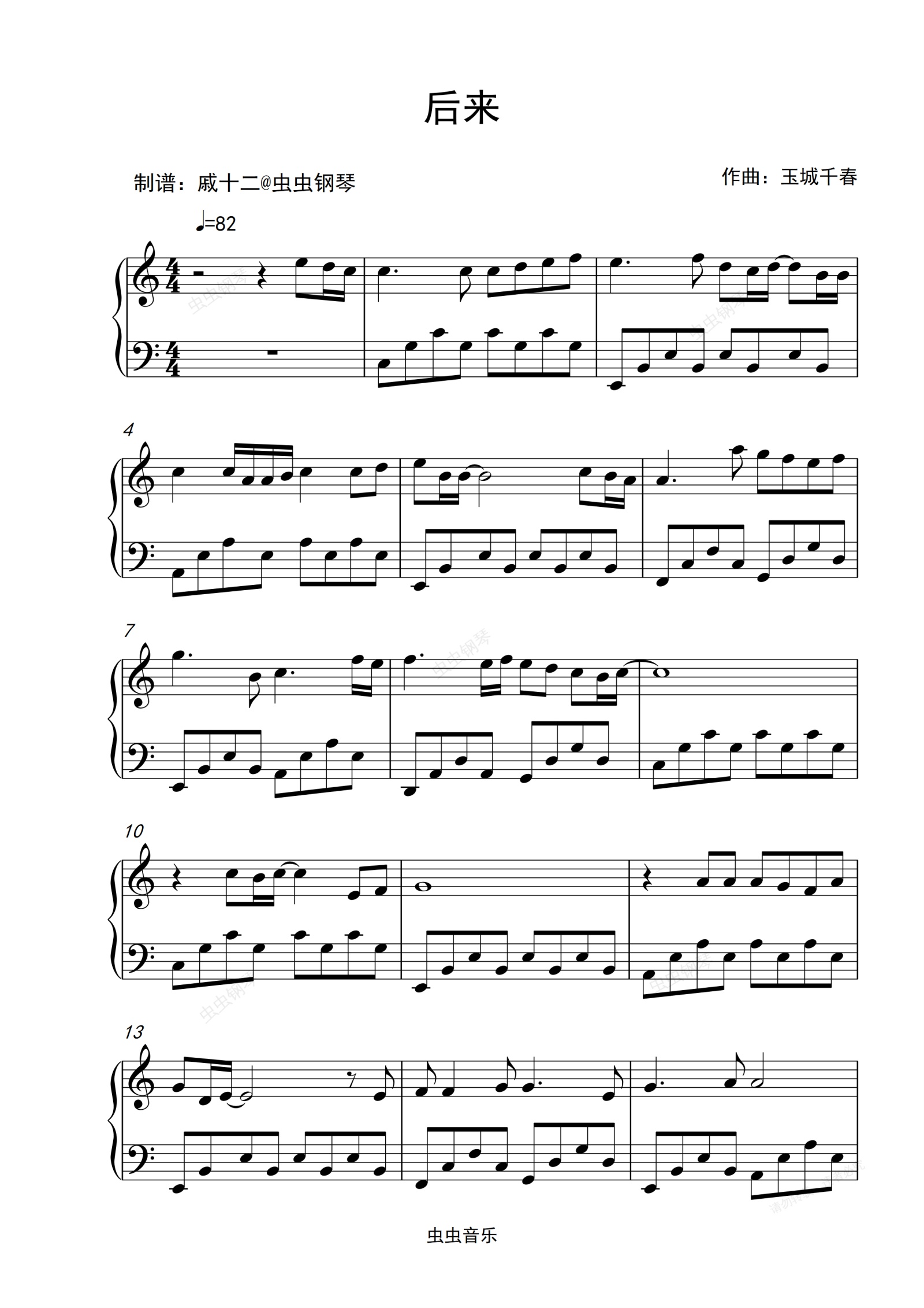 钢琴谱:后来-C调简单版