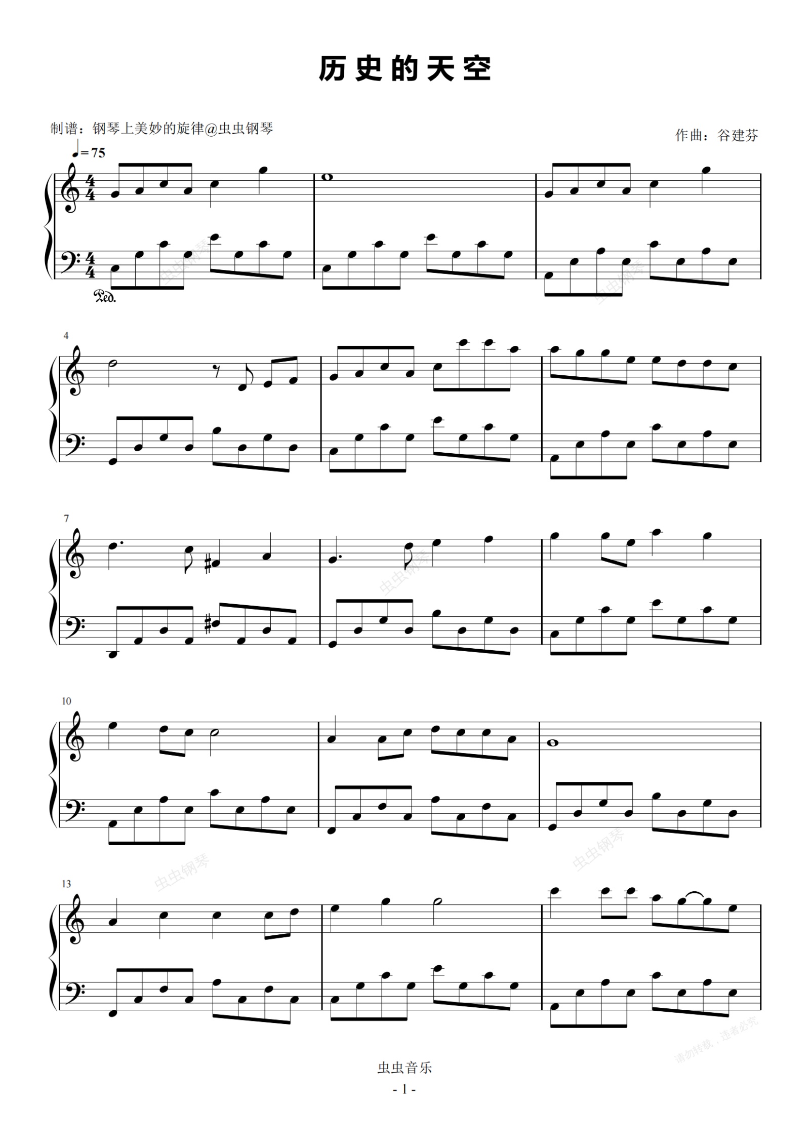 钢琴谱:历史的天空 C调简易版 毛阿敏 流行经典