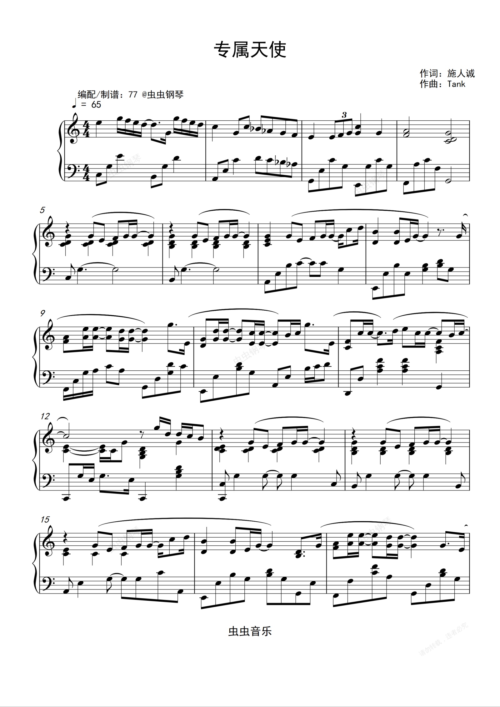 钢琴谱:Tank-《专属天使》钢琴独奏谱 C调