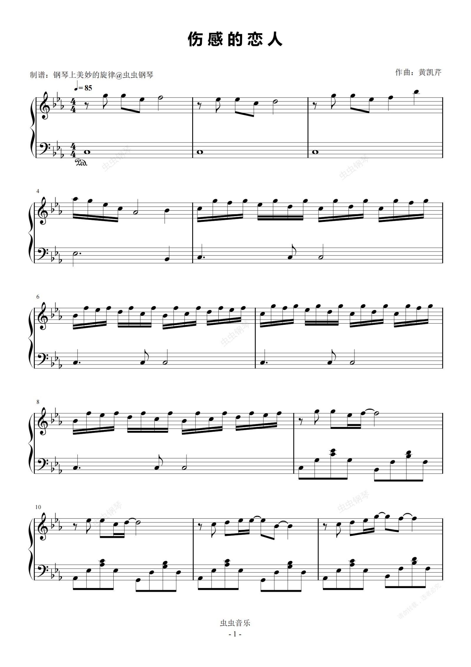 钢琴谱:伤感的恋人 原调简易版 黄凯芹 流行经典