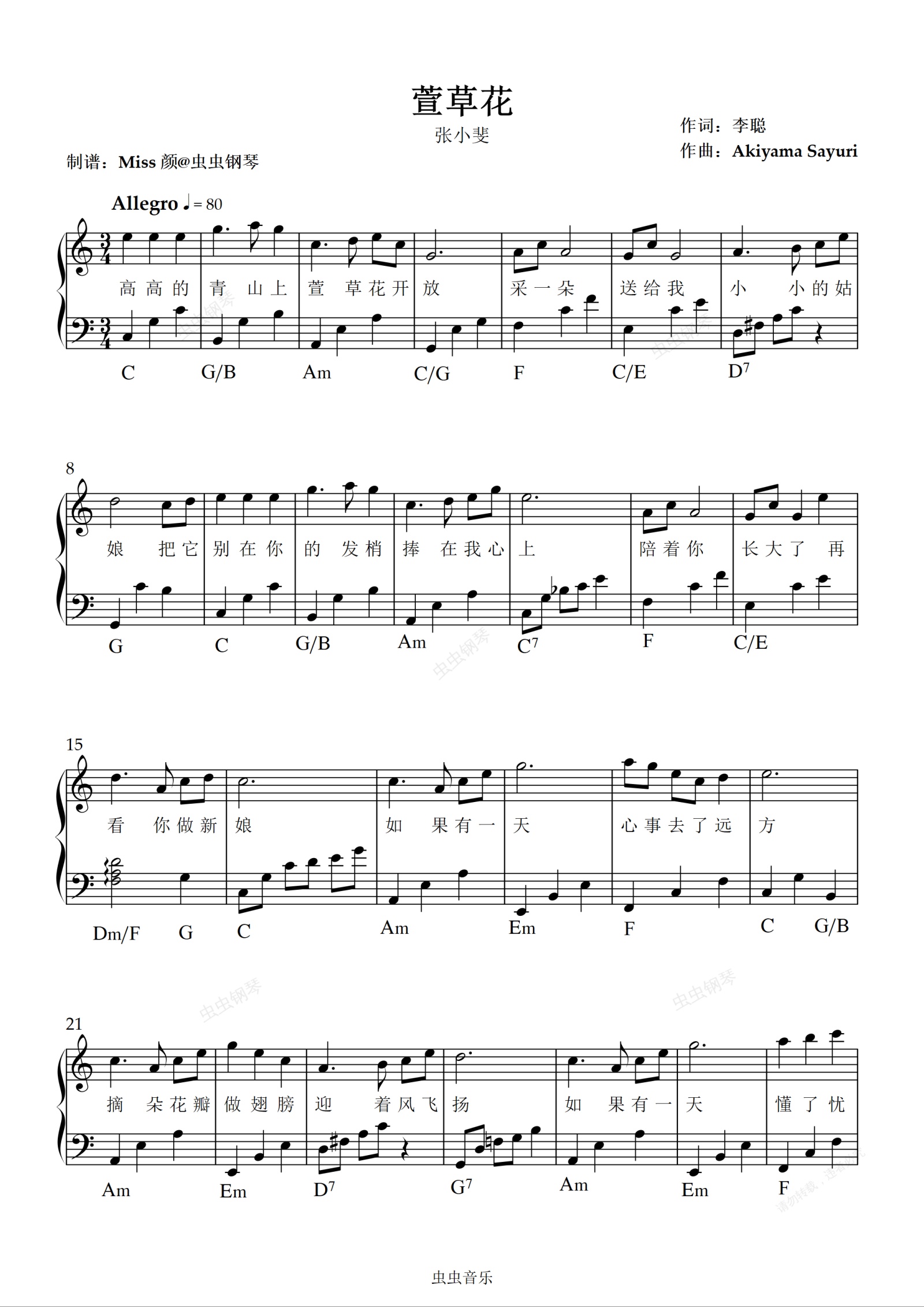 钢琴谱:萱草花 C调 简单易上手(电影“你好李焕英”主题曲)