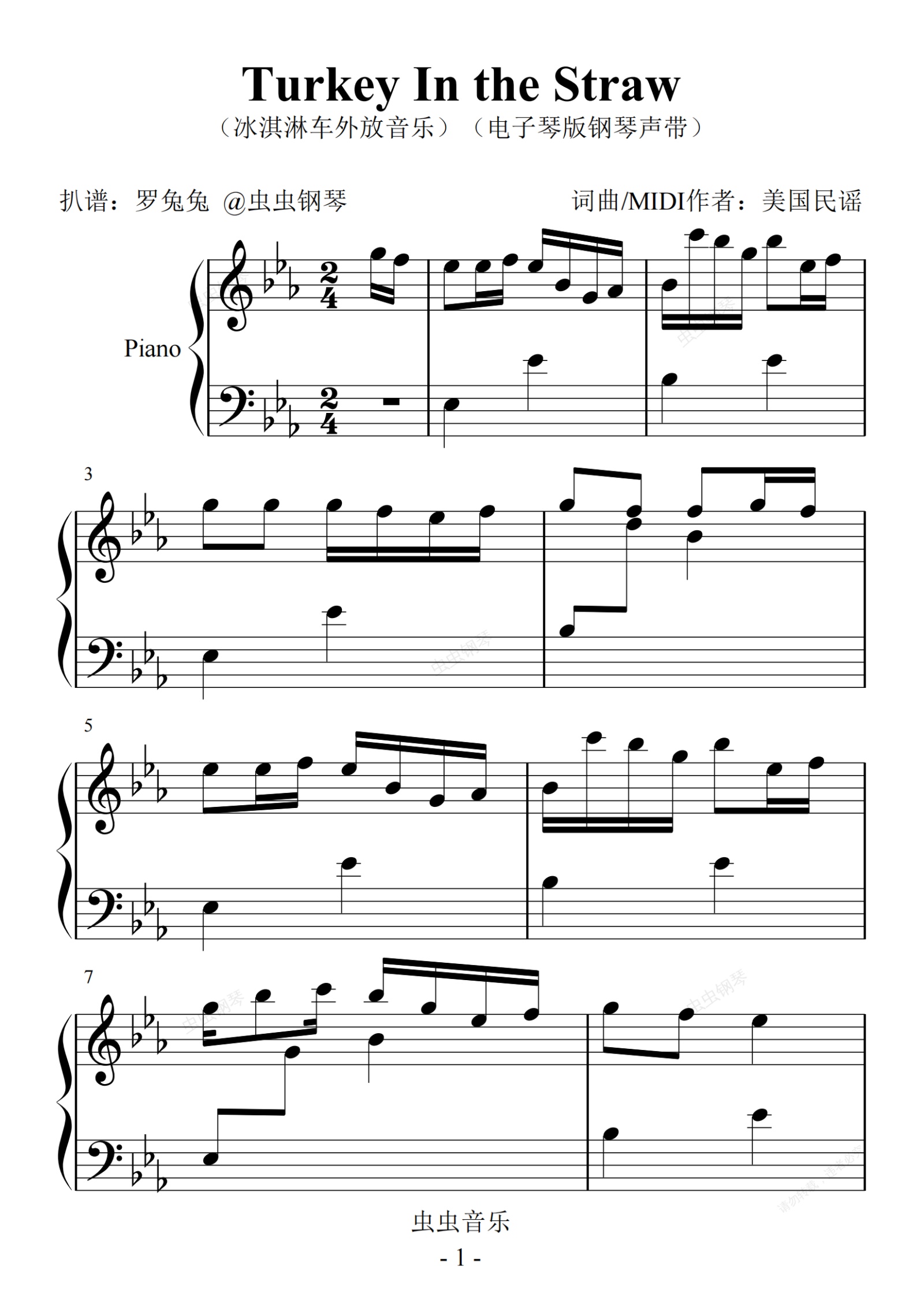 钢琴谱:Turkey In the Straw(冰淇淋车外放音乐)(电子琴版钢琴声带)