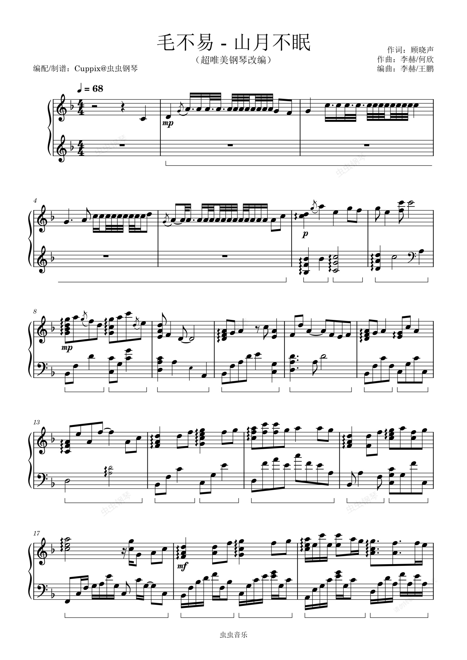 钢琴谱:《山月不眠》Cuppix编配-超唯美钢琴独奏(毛不易,云之羽 插曲)