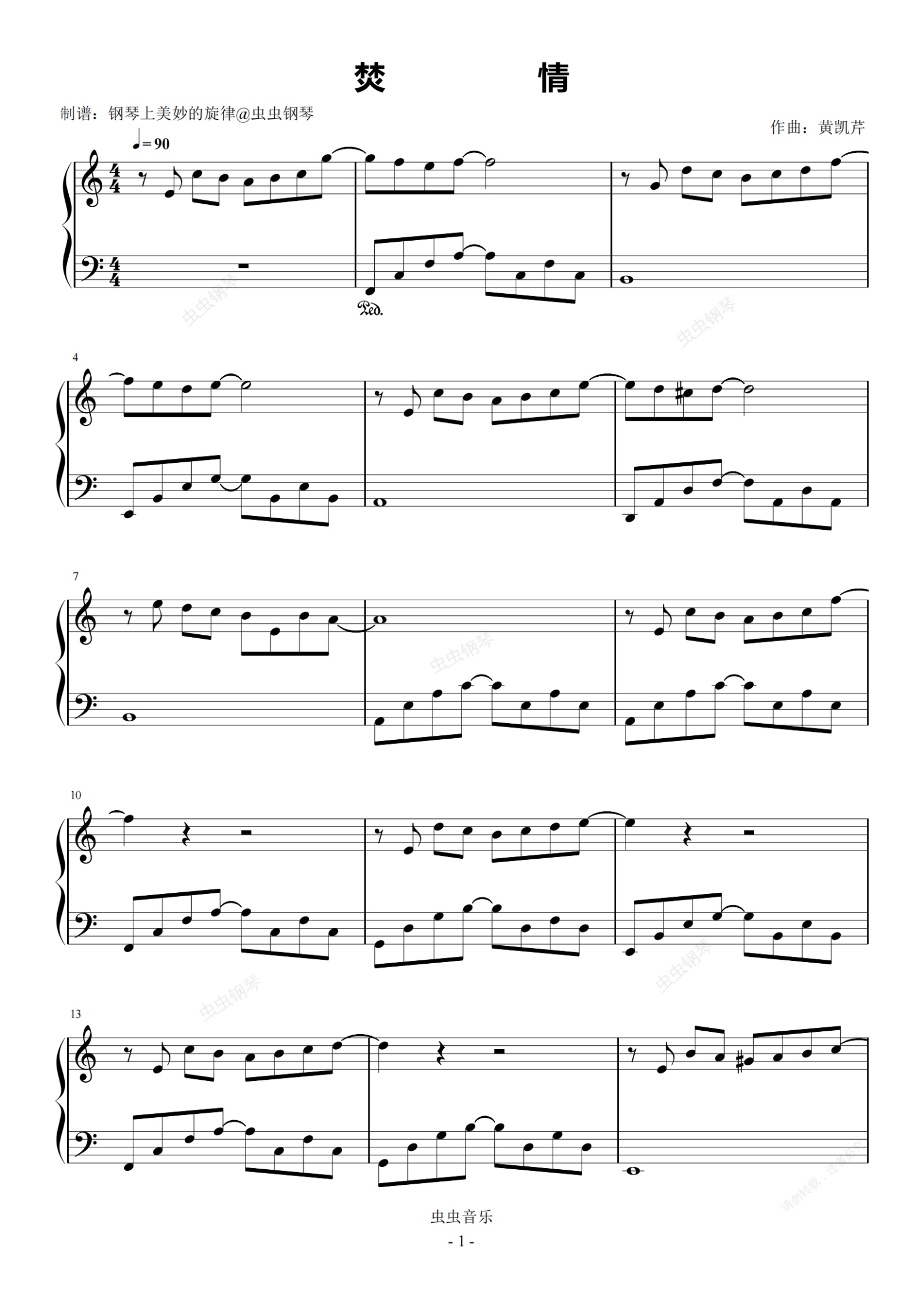 钢琴谱:焚情  C调简易版  黄凯芹  流行经典