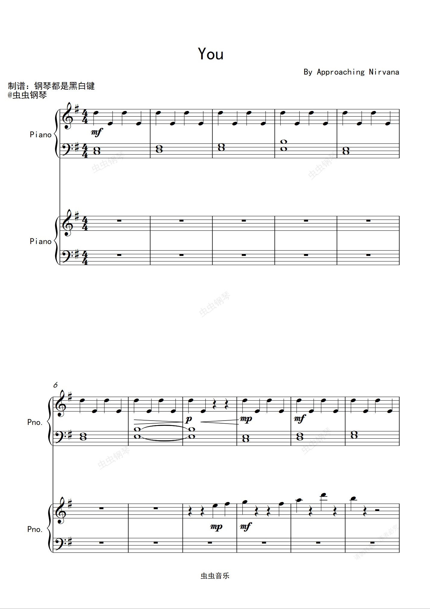 钢琴谱:《You》- Approaching Nirvana 神级电音【接近原版四手联弹】