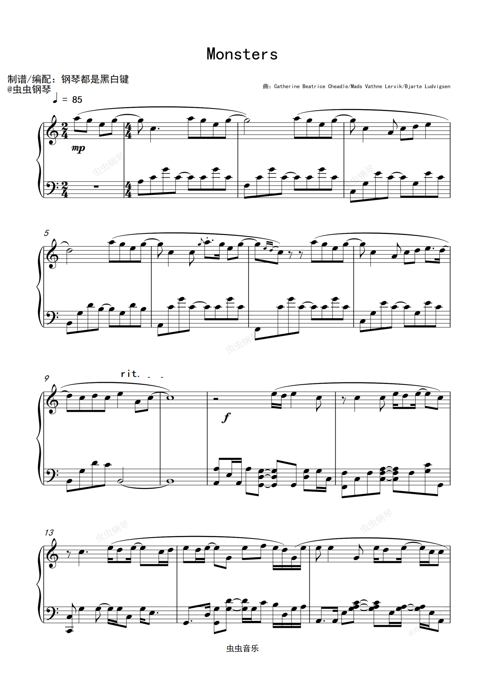 钢琴谱:治愈系英文热歌【Monsters】钢琴演奏版