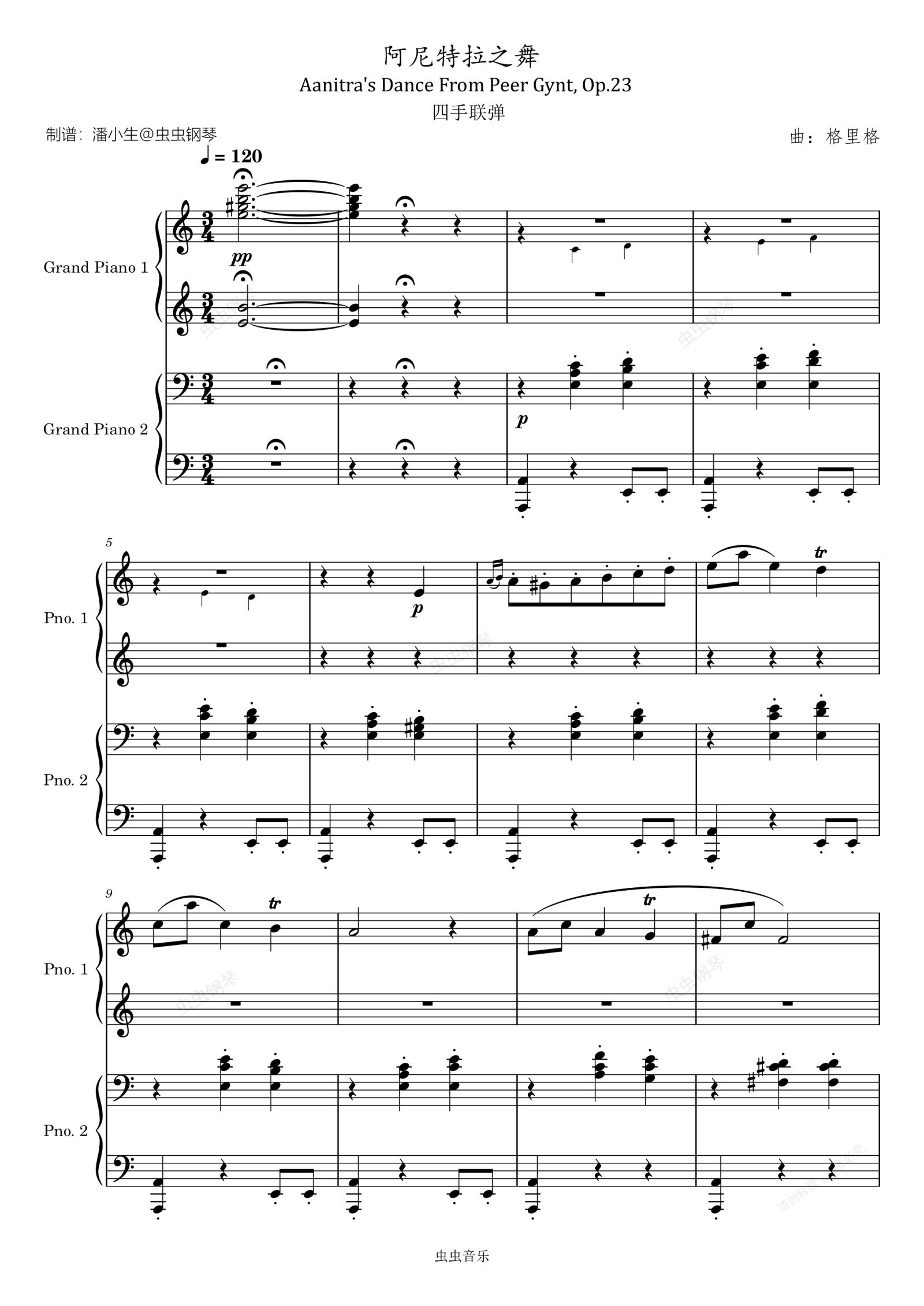 钢琴谱:格里格 Anitra's Dance 阿尼特拉之舞,四手联弹 培尔.金特 (Peer Gynt Op.23 ) 二重奏 安妮特拉之舞