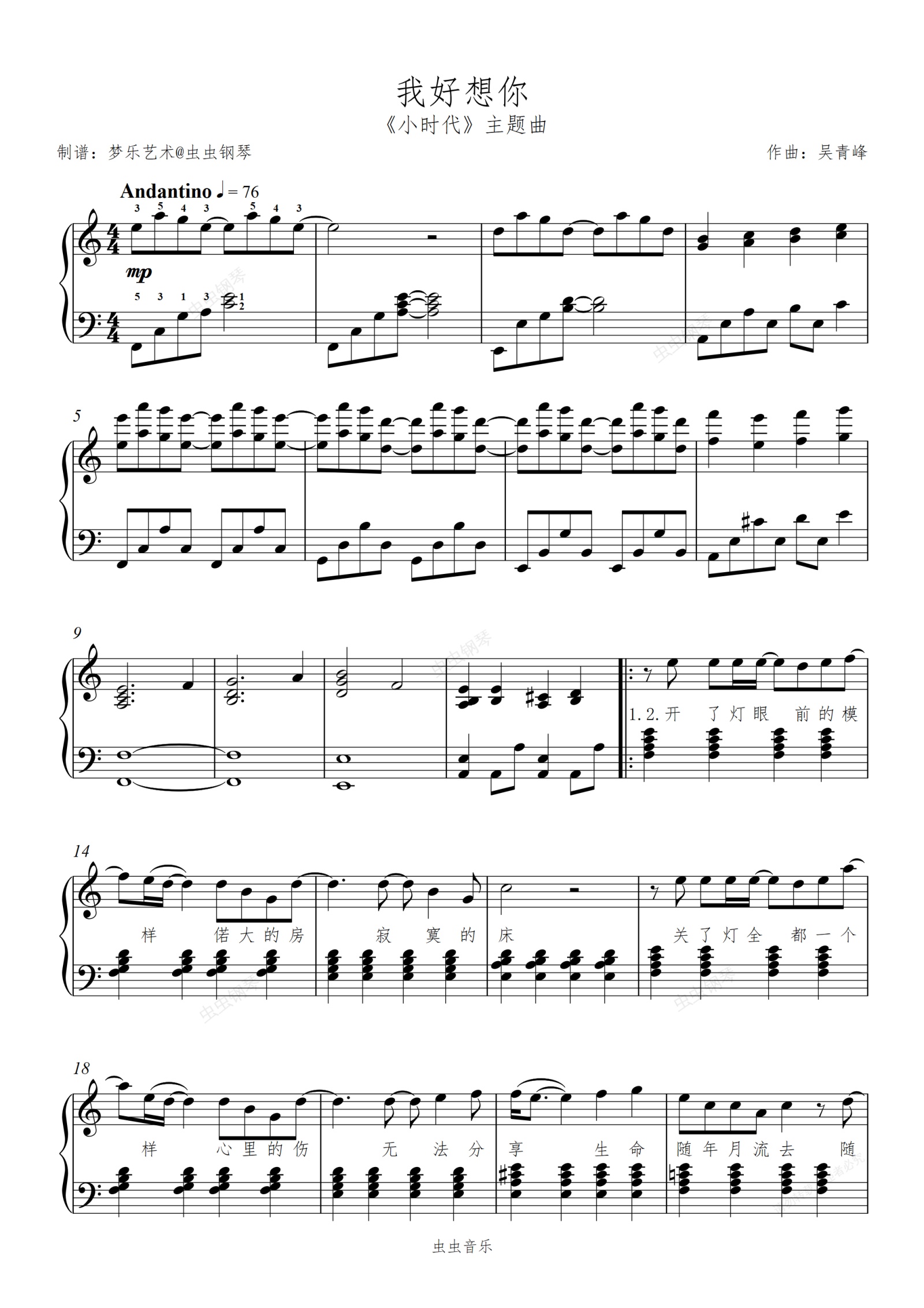 钢琴谱:我好想你(C调+歌词)苏打绿