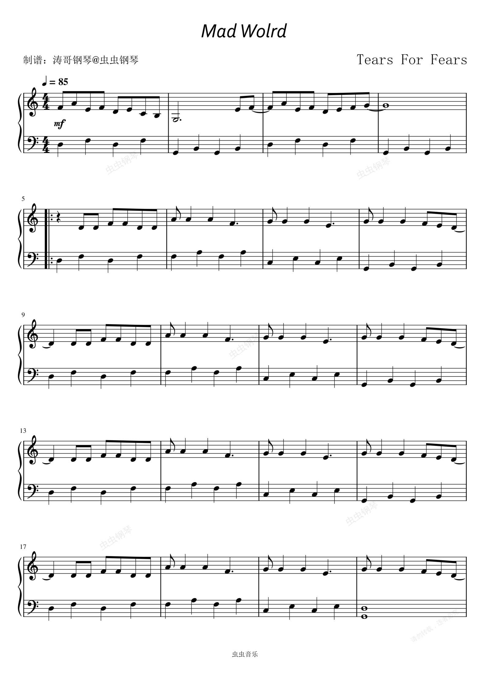 钢琴谱:Mad World - Tears For Fears