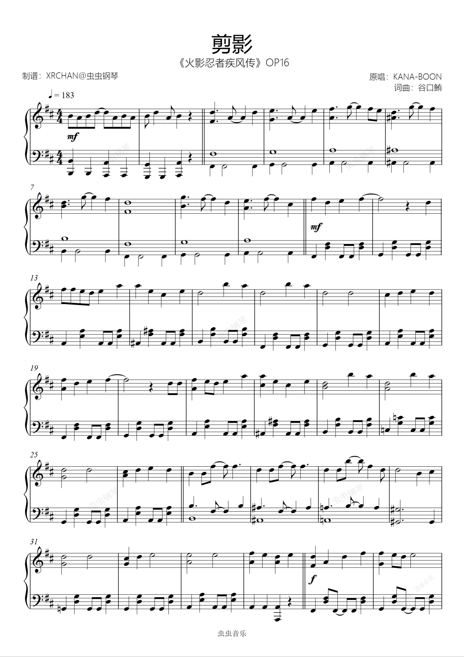 钢琴谱:剪影《火影忍者疾风传》OP16 初级