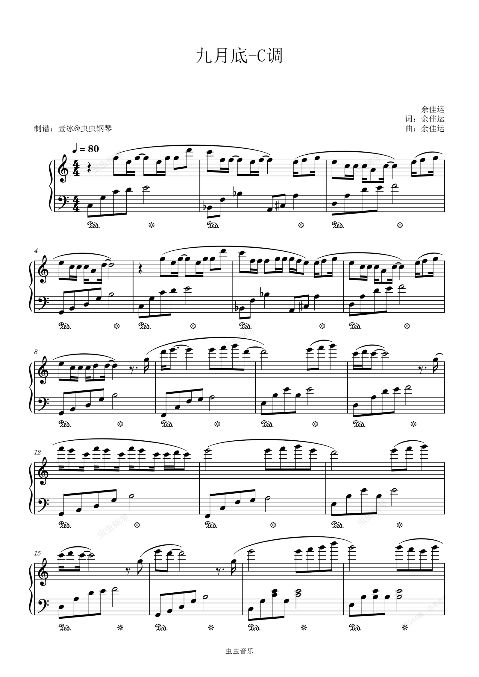 钢琴谱:九月底//余佳运 - C调 简单易上手