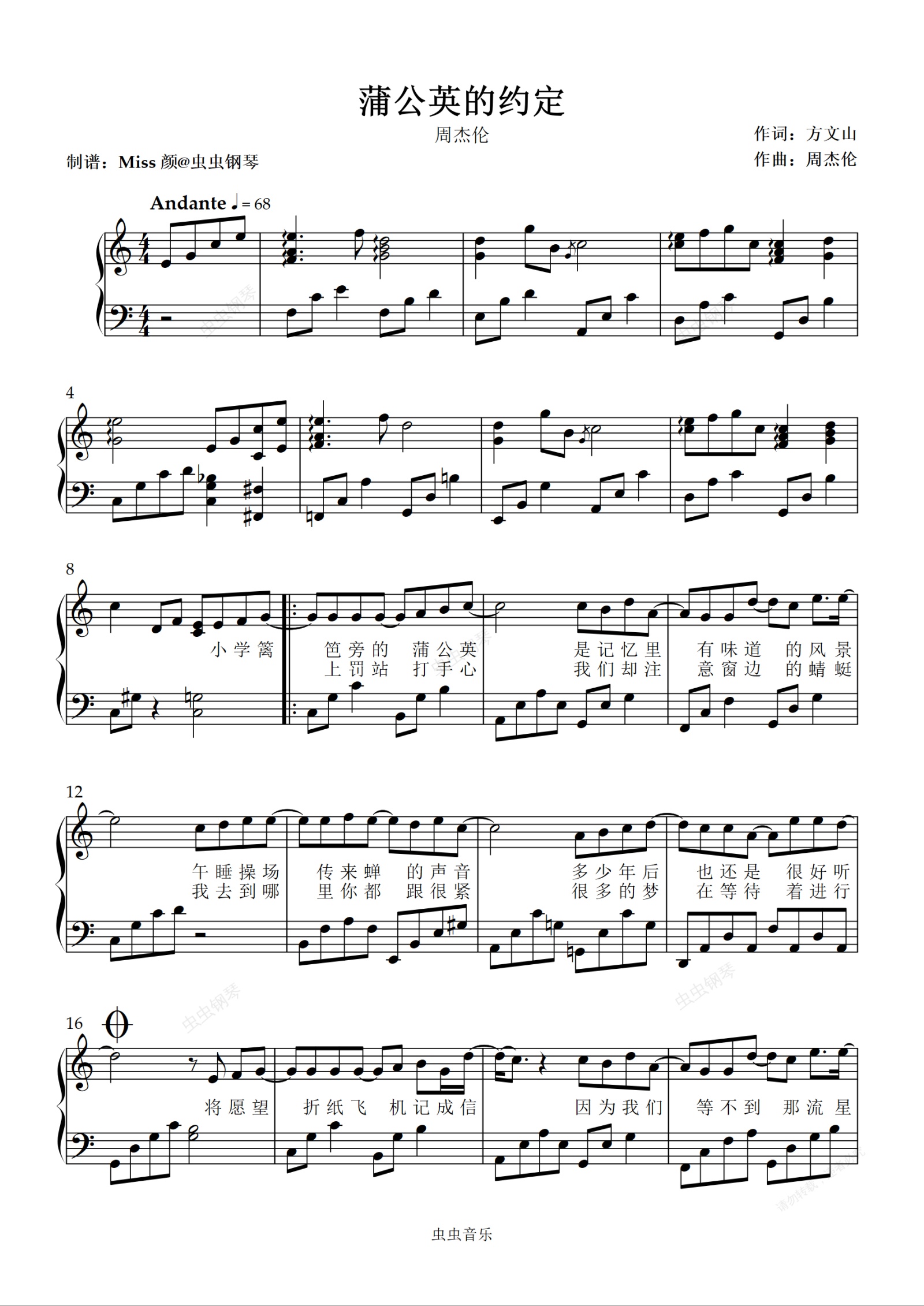 钢琴谱:蒲公英的约定  周杰伦 C调 好听简单 易上手完整版