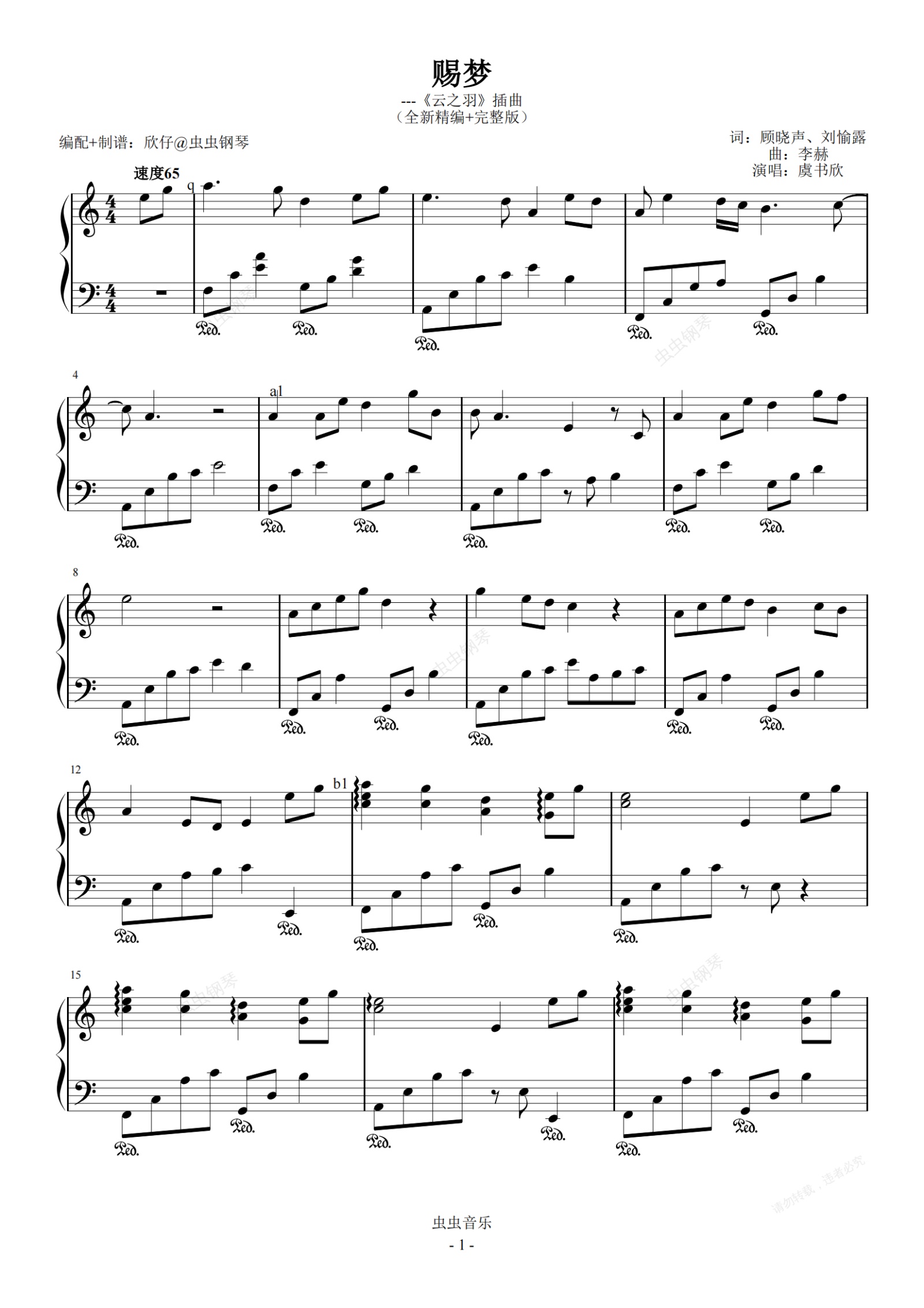 钢琴谱:虞书欣-a-《赐梦》(《云之羽》插曲、完整版)