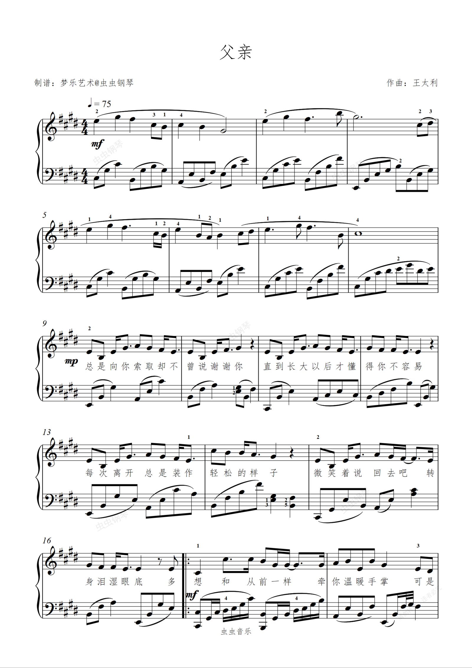 钢琴谱:父亲 原调+歌词+指法 筷子兄弟