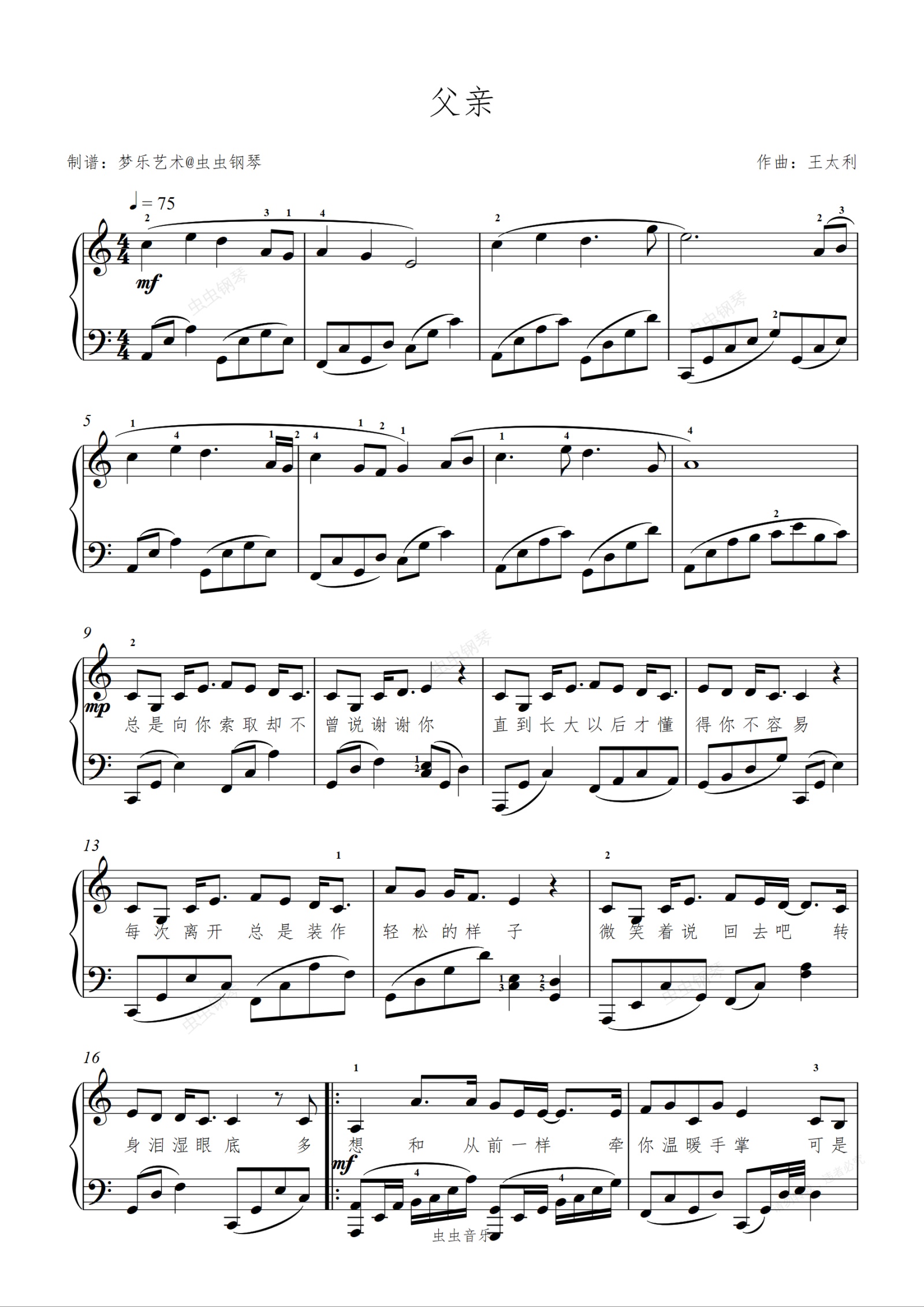 钢琴谱:父亲 C调+歌词+指法 筷子兄弟
