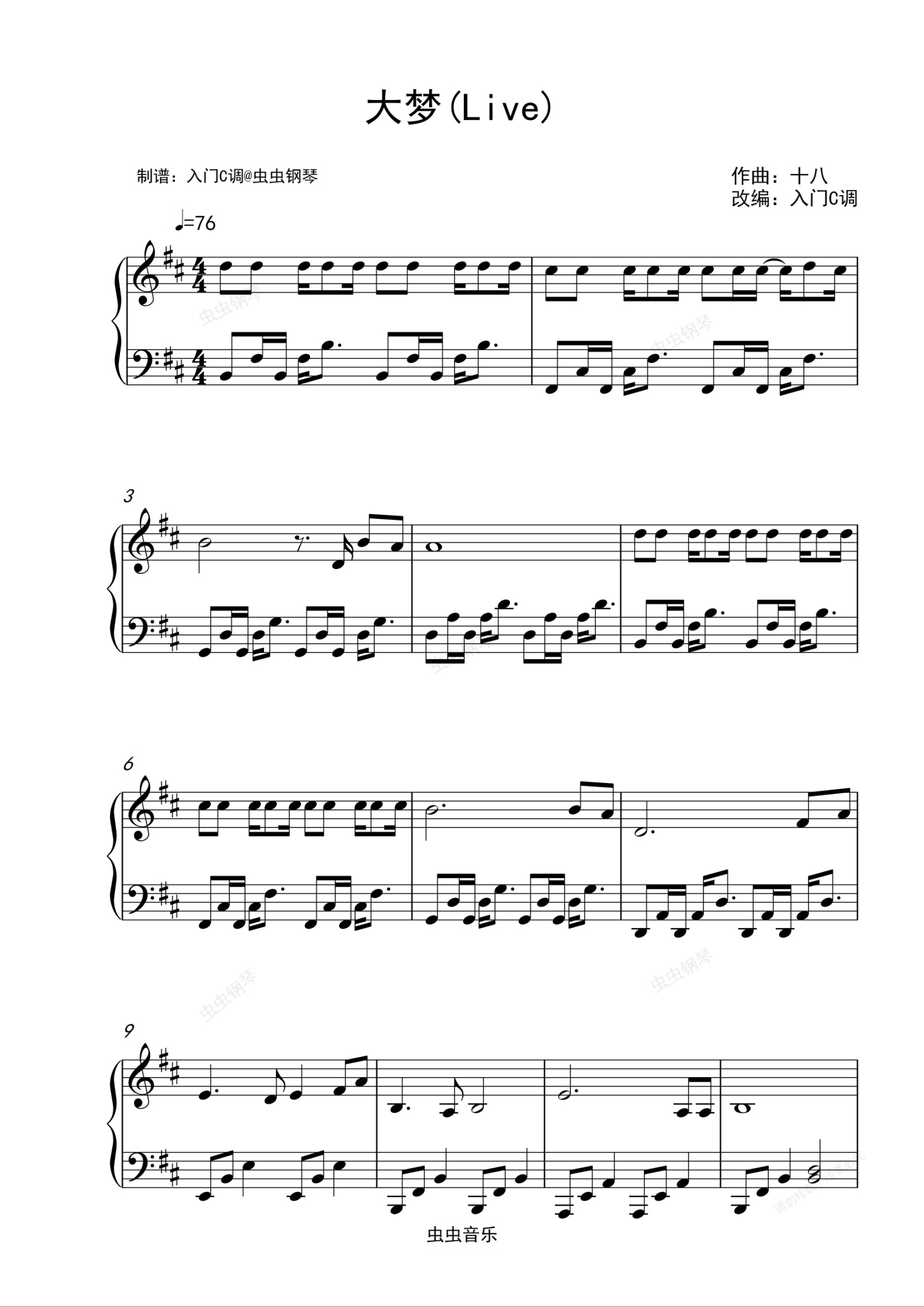钢琴谱:任素汐、瓦依那《大梦(Live)》D调入门简单版