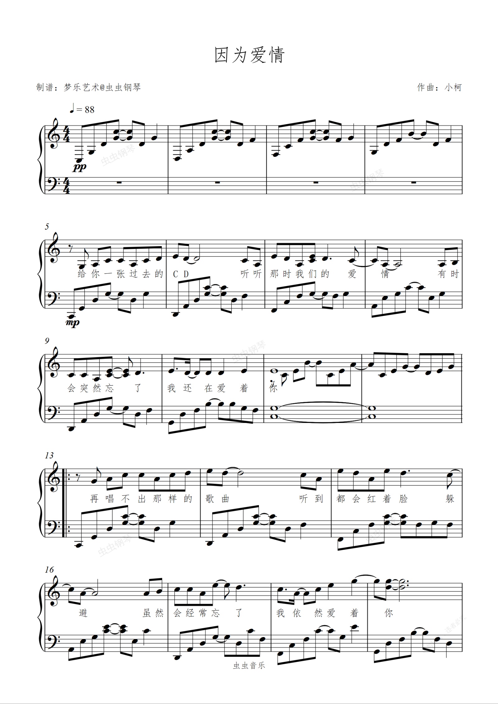 钢琴谱:因为爱情 C调 附歌词 王菲