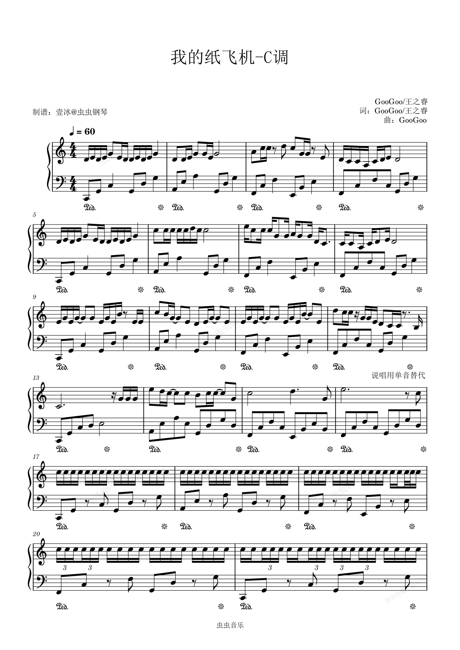 钢琴谱:我的纸飞机//GooGoo/王之睿 - C调 简单易上手