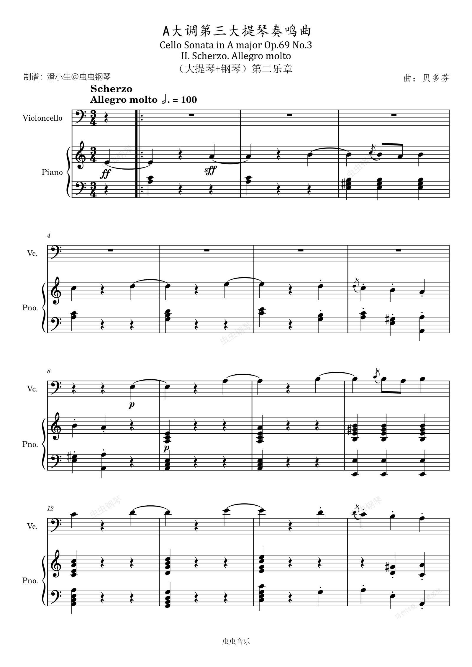 钢琴谱:贝多芬,A大调第三大提琴奏鸣曲,Op.69 No.3 原版,第二乐章 大提琴+钢琴