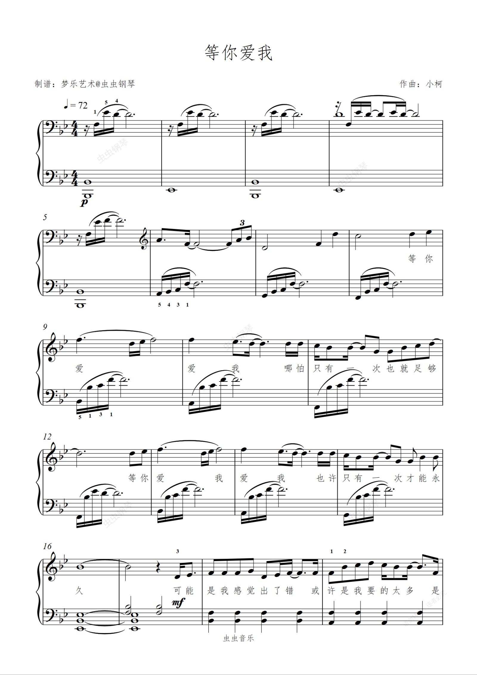 钢琴谱:等你爱我 降B调+指法+歌词 陈明