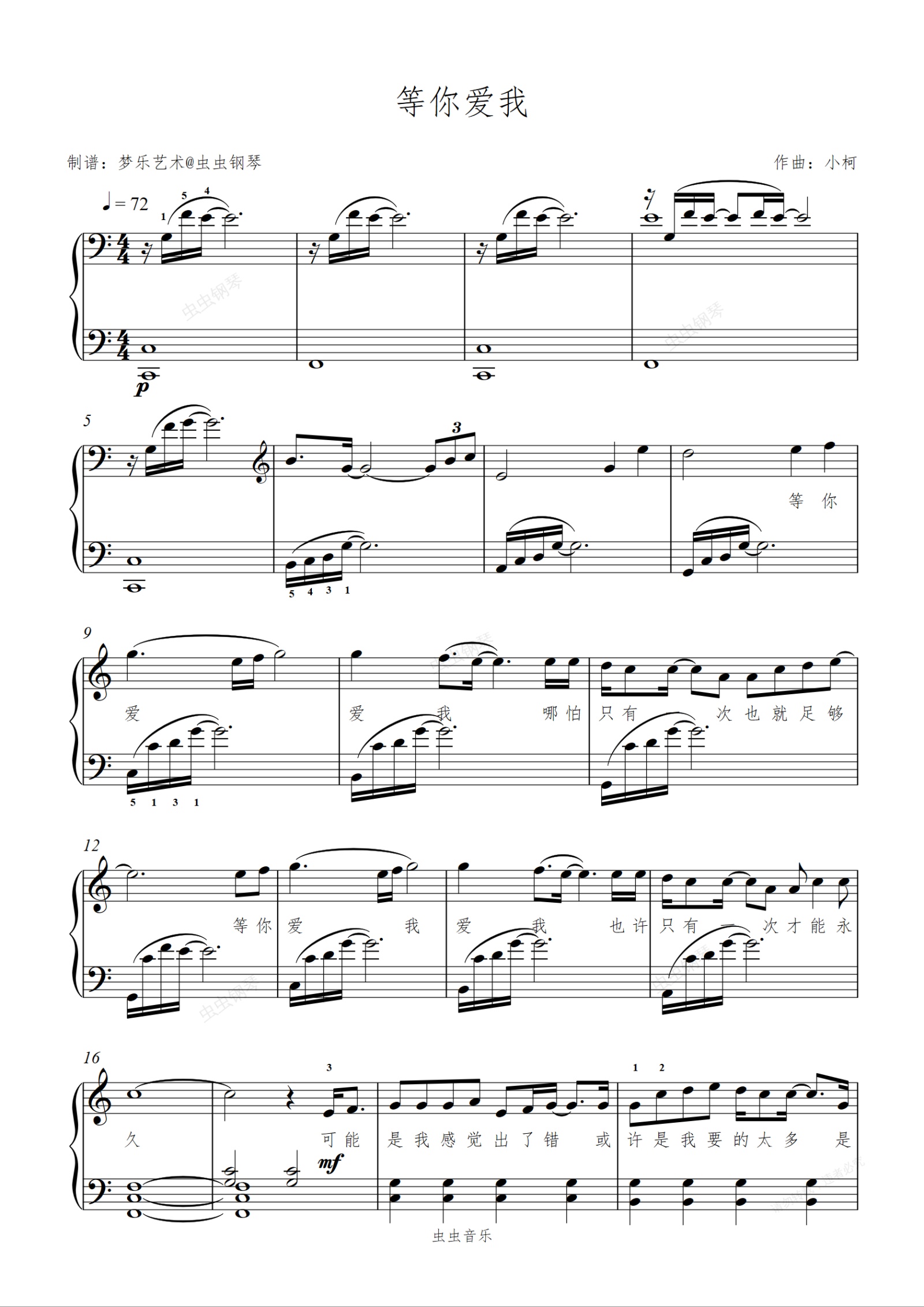 钢琴谱:等你爱我 C调+指法+歌词 陈明