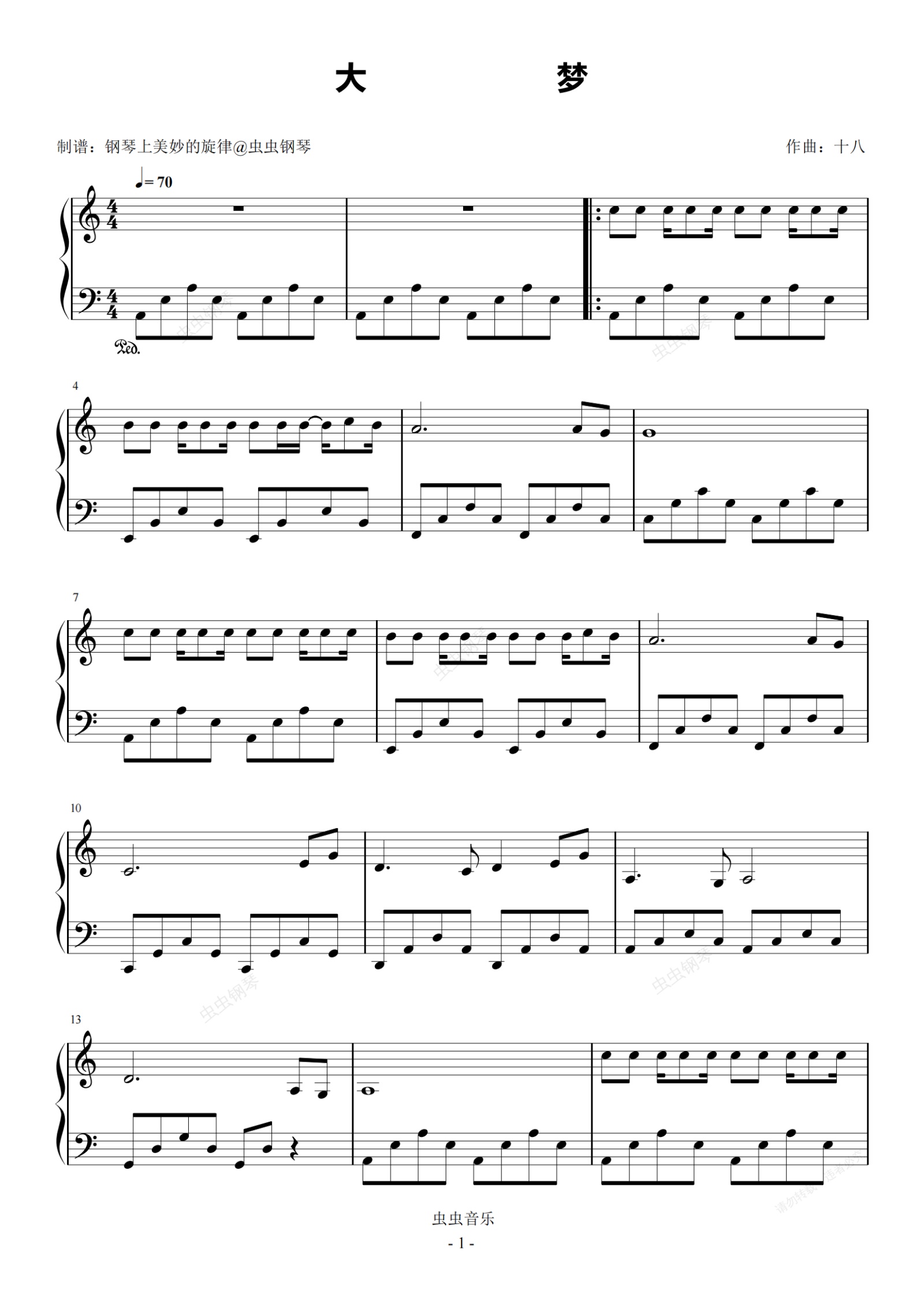 钢琴谱:大梦 C调简单版 瓦依那/任素汐