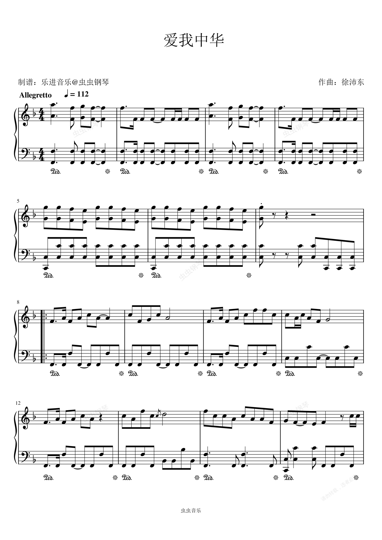 钢琴谱:《爱我中华》F调