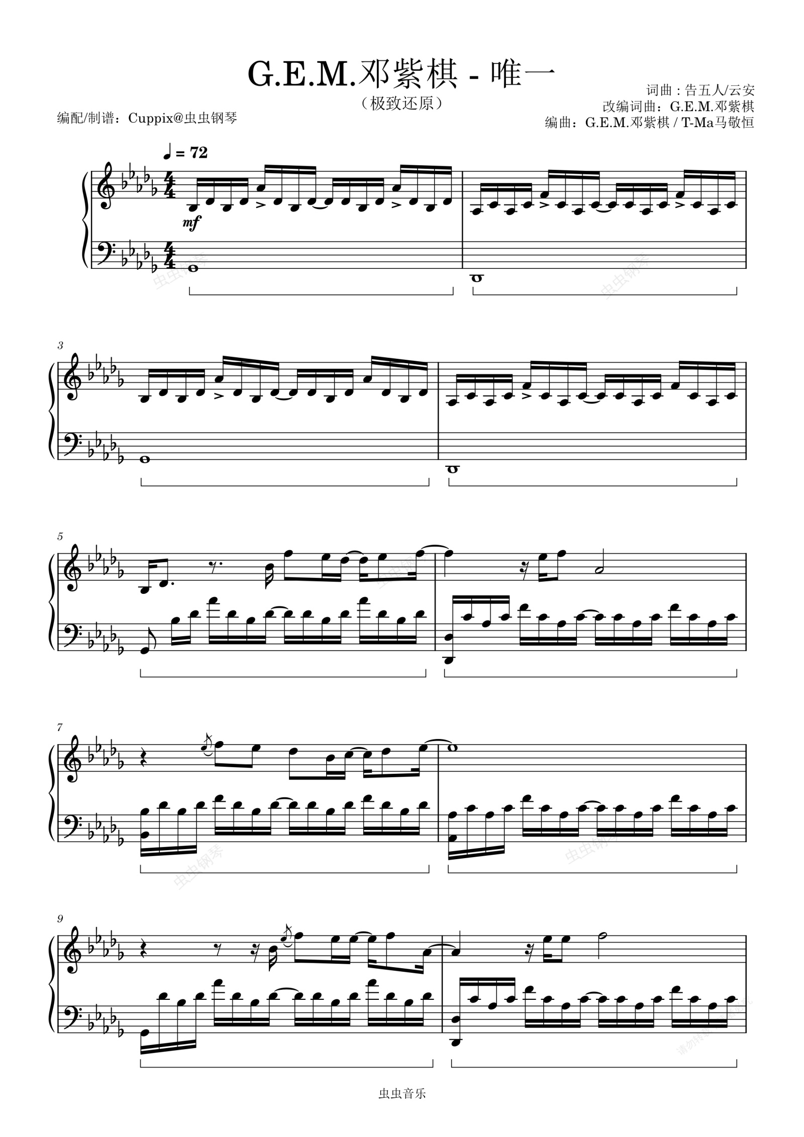 钢琴谱:邓紫棋《唯一》极致还原-原调(Cuppix编配)