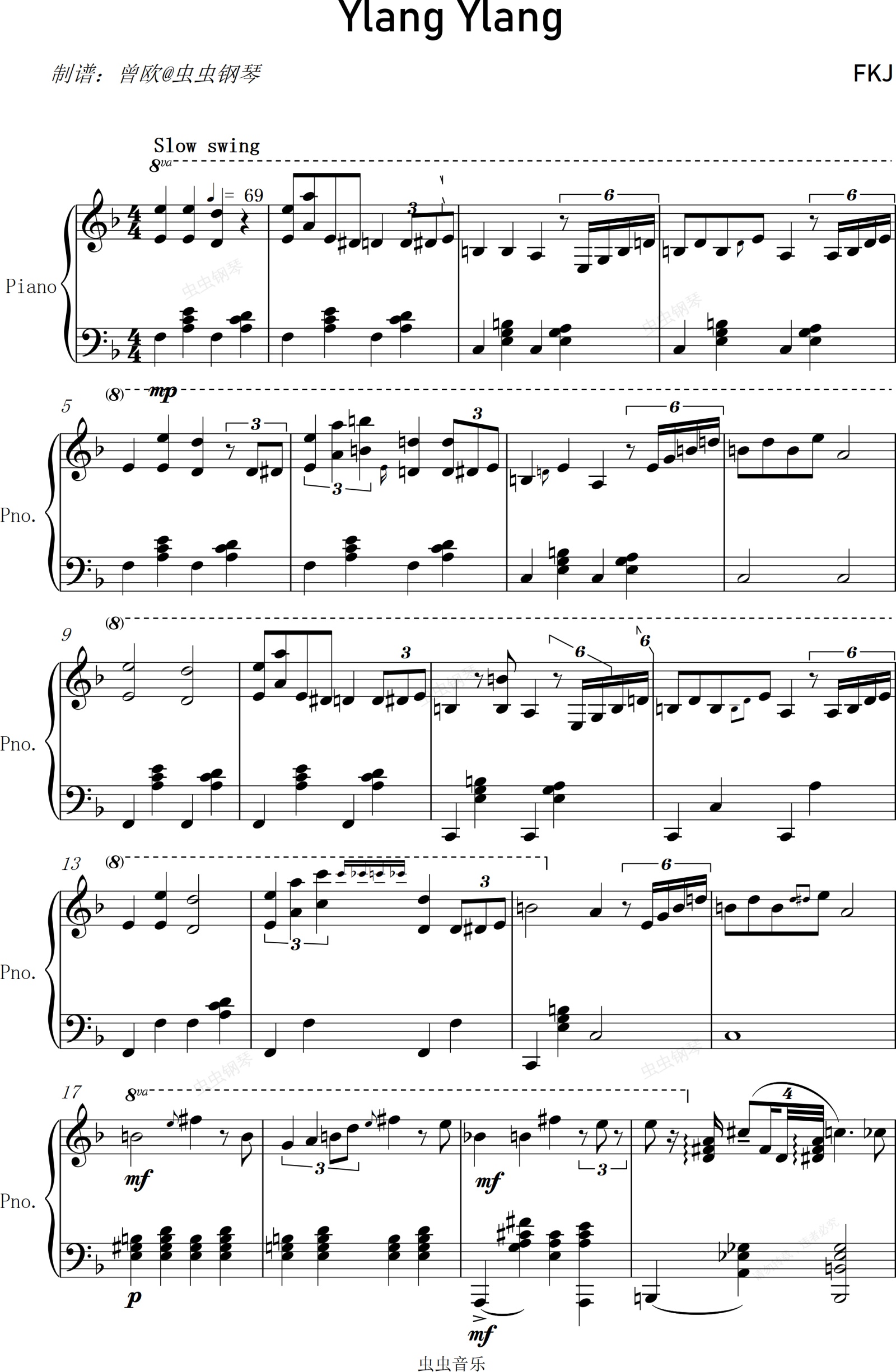 钢琴谱:Ylang Ylang - FKJ「那里几乎无人居住,也没有电,到了夜晚我就只能用借用发电机来做歌。那里有绝美的风景、山丘、海滩,是世界上最美的地方之一,我找到了如梦境般的做歌状态」