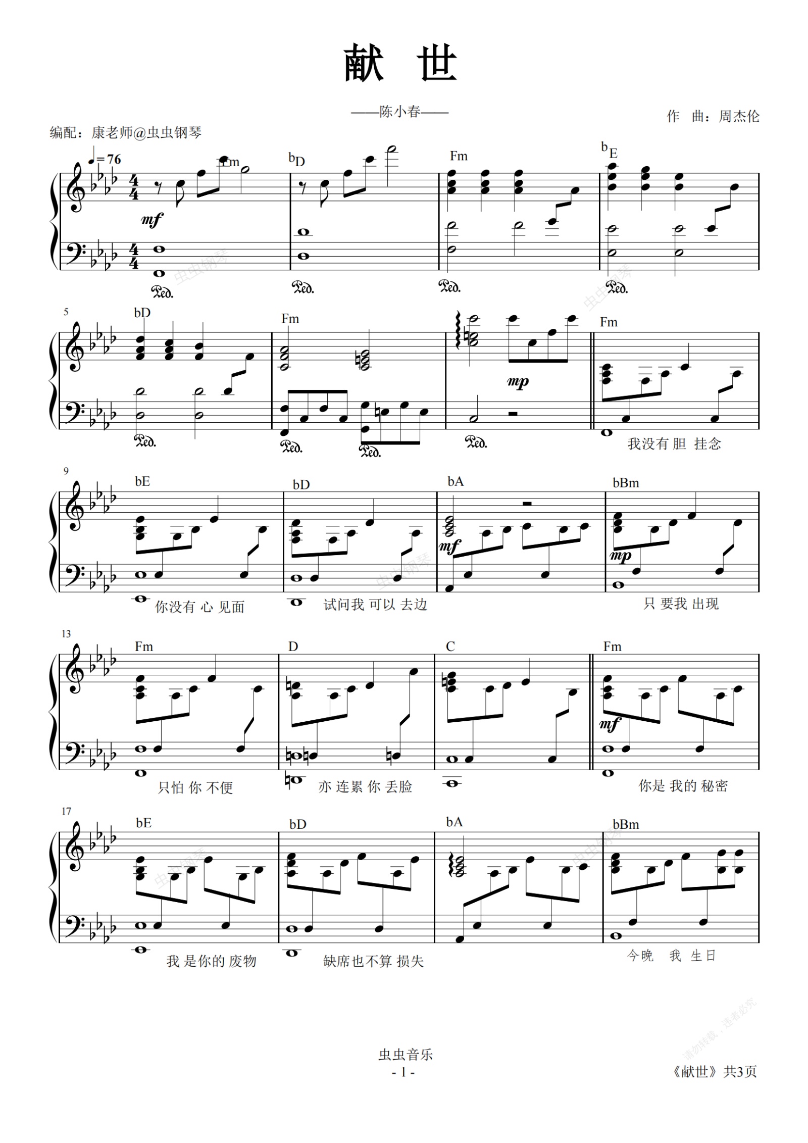 钢琴谱:献世-陈小春-高度还原版