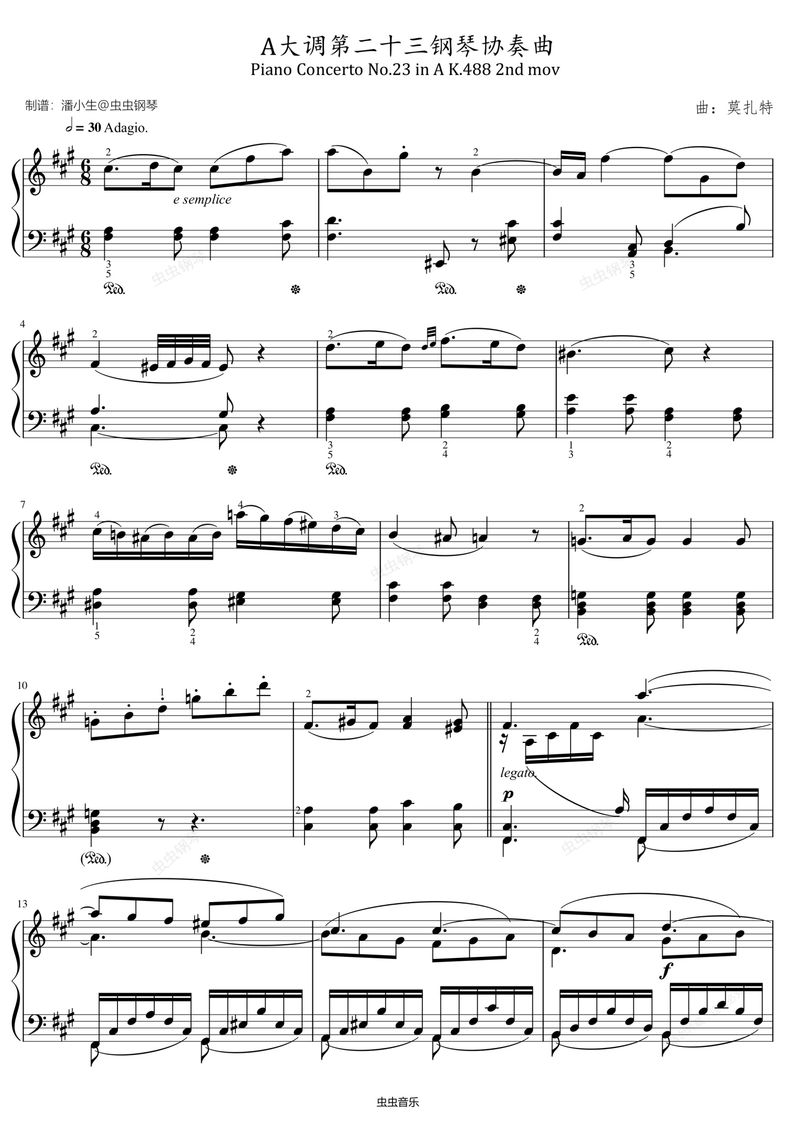 钢琴谱:莫扎特 A大调第二十三钢琴协奏曲 K.488 原版带指法 第二乐章 钢琴独奏 Piano Concerto No.23 in A major