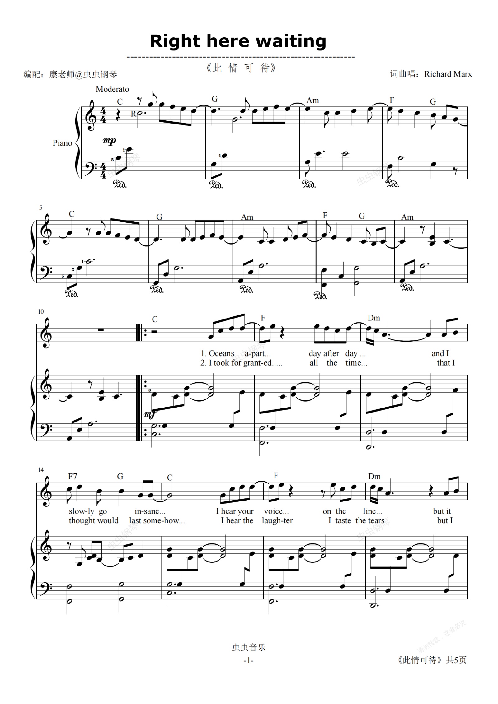 钢琴谱:Right here waiting钢琴弹唱(康老师版)