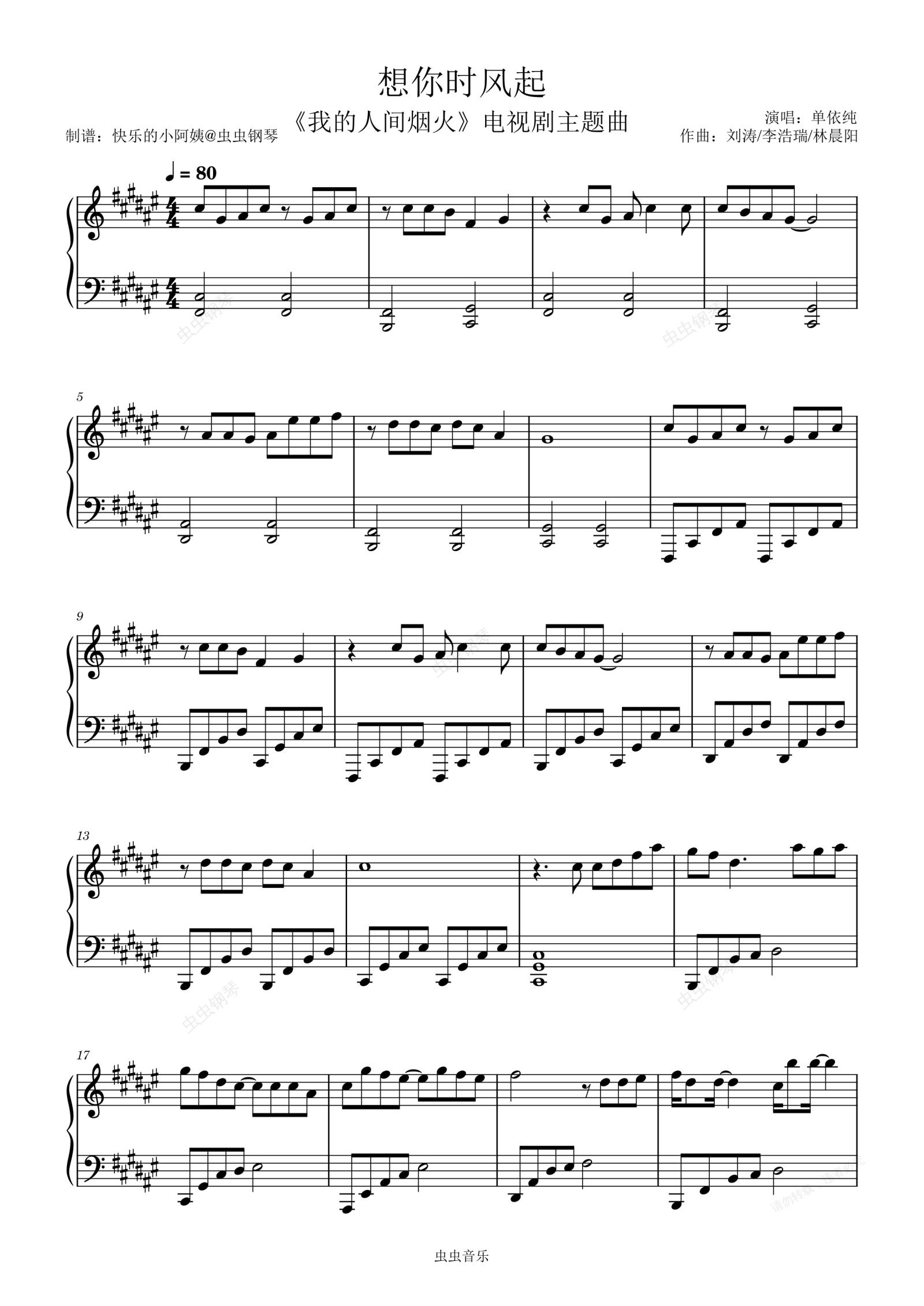 钢琴谱:想你时风起-《我的人间烟火》主题曲单依纯
