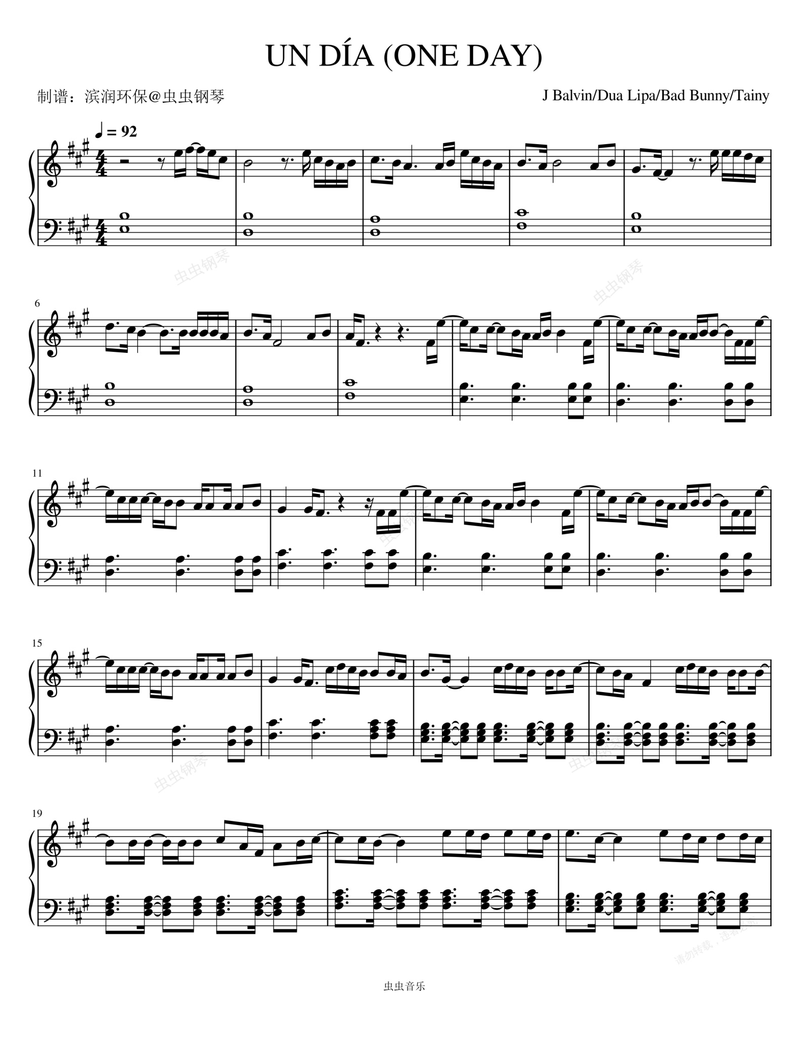 钢琴谱:UN DIA (ONE DAY) - J Balvin/Dua Lipa/Bad Bunny/Tainy
