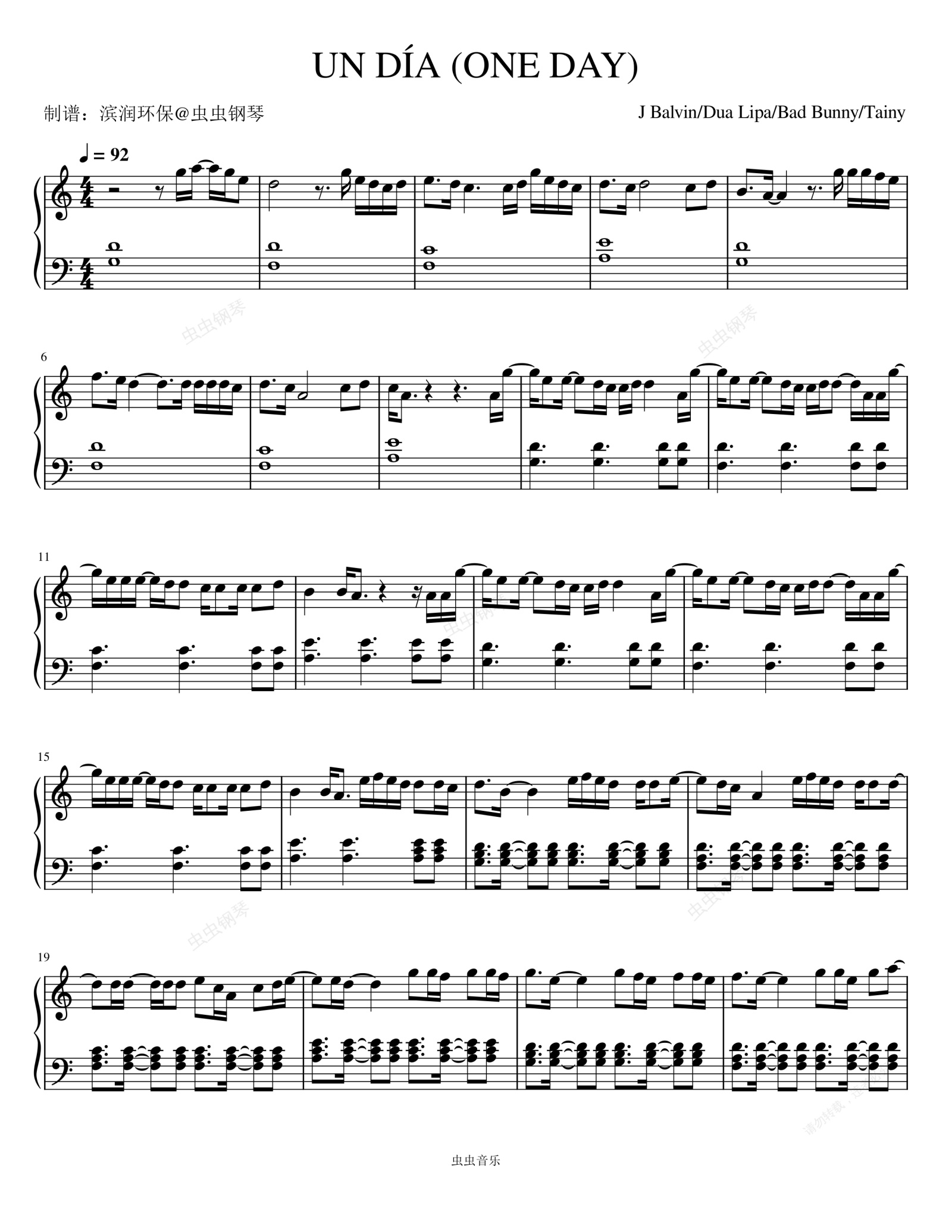 钢琴谱:UN DIA (ONE DAY) - J Balvin/Dua Lipa/Bad Bunny/Tainy