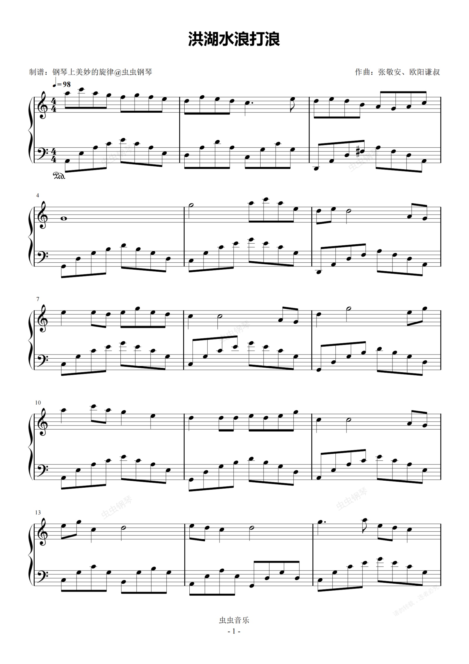 钢琴谱:洪湖水浪打浪 C调简易版 经典流行
