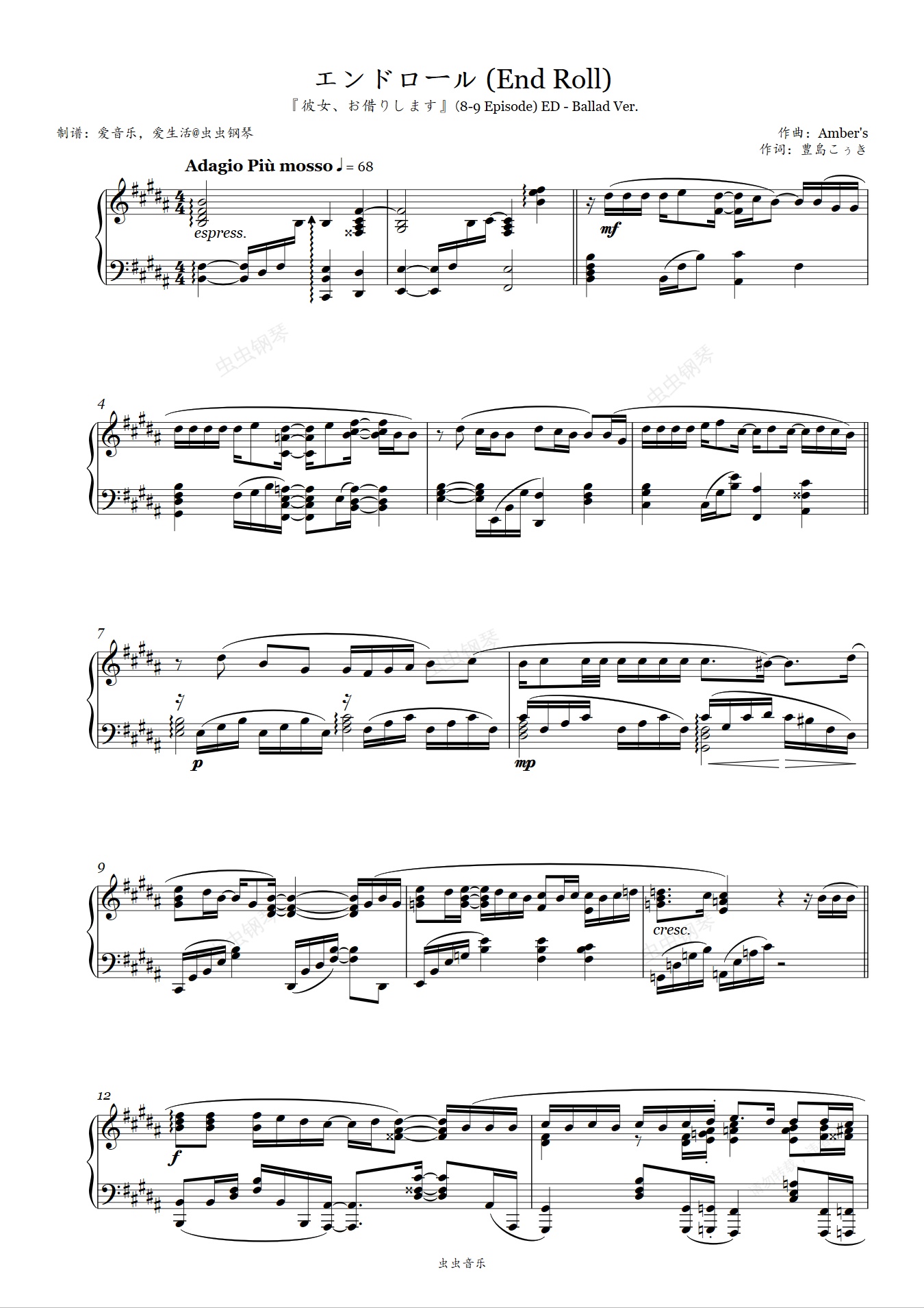 钢琴谱:租借女友 第三季 ED エンドロール 抒情版