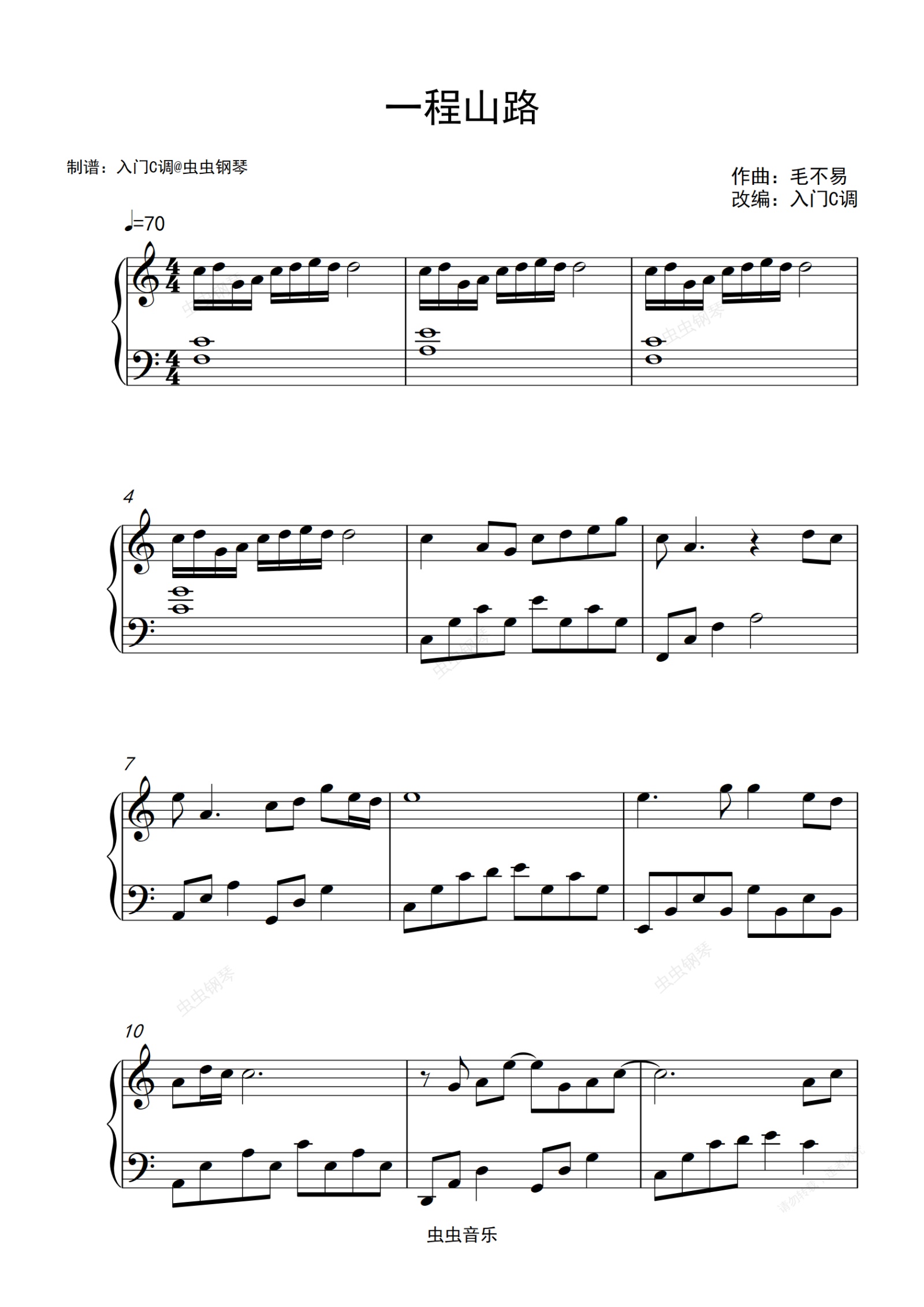 钢琴谱:毛不易《一程山路》入门C调抒情简单版