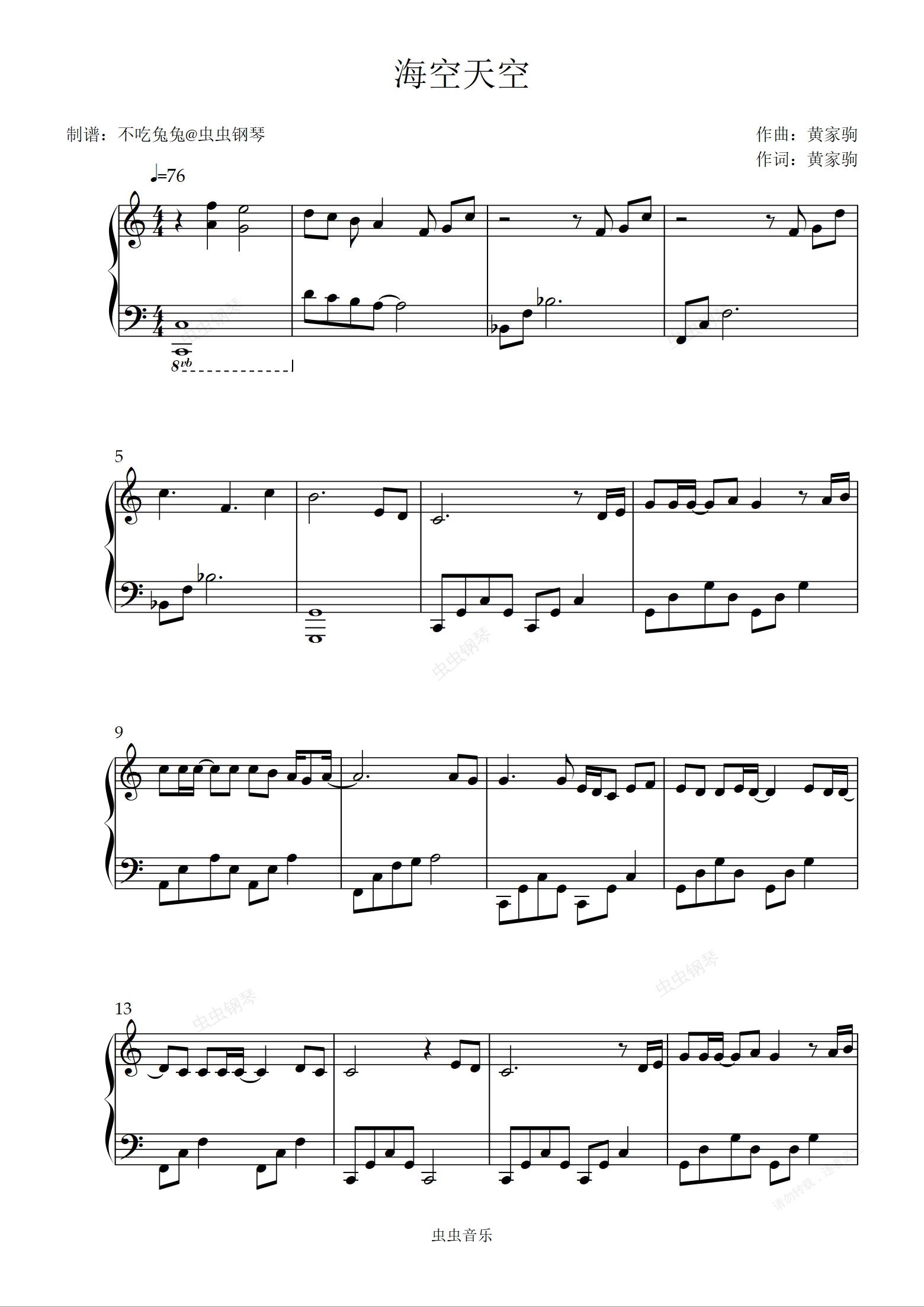 钢琴谱:海阔天空 C调超级简单