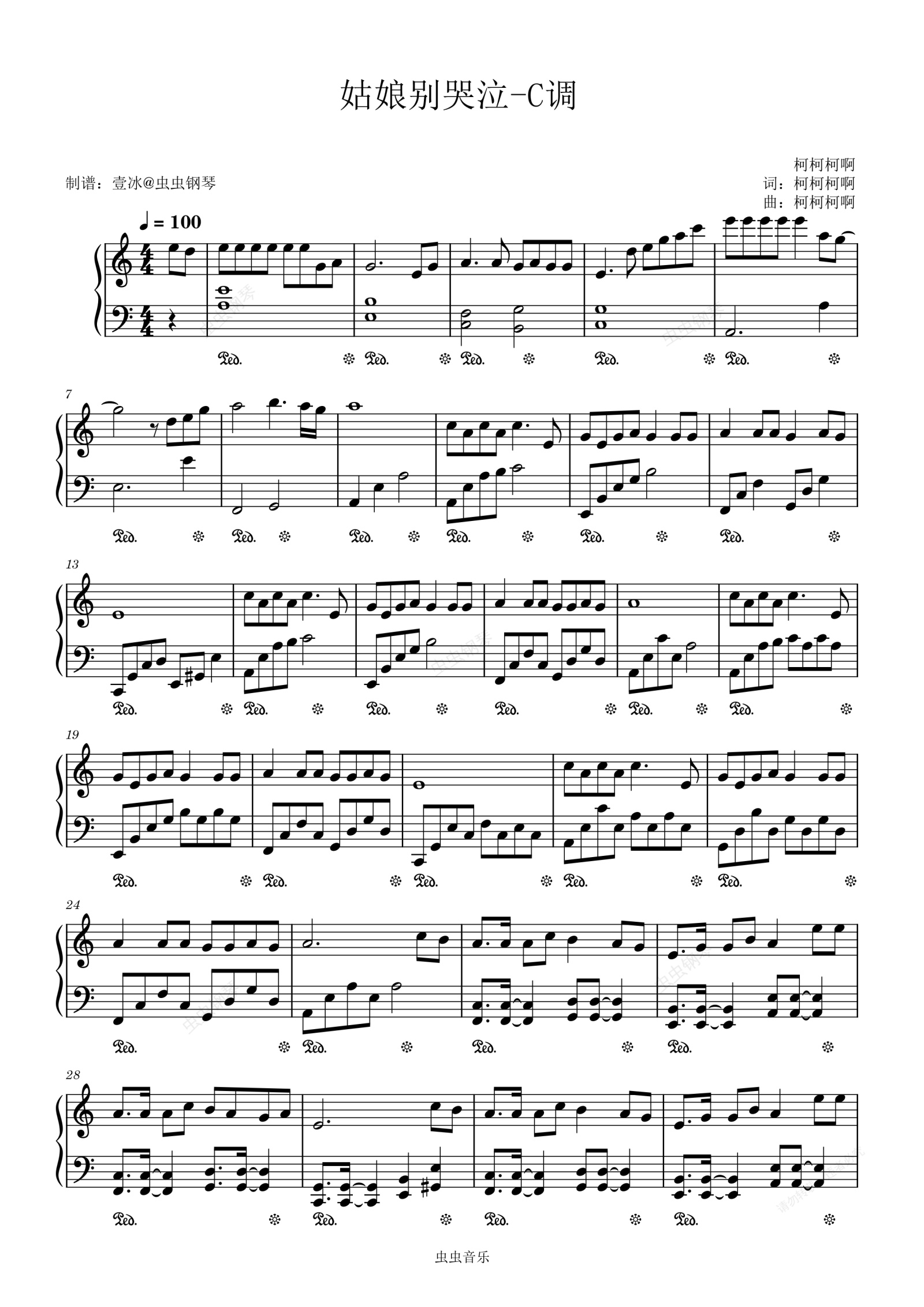 钢琴谱:【网络热曲】姑娘别哭泣//柯柯柯啊 - C调 简单易上手