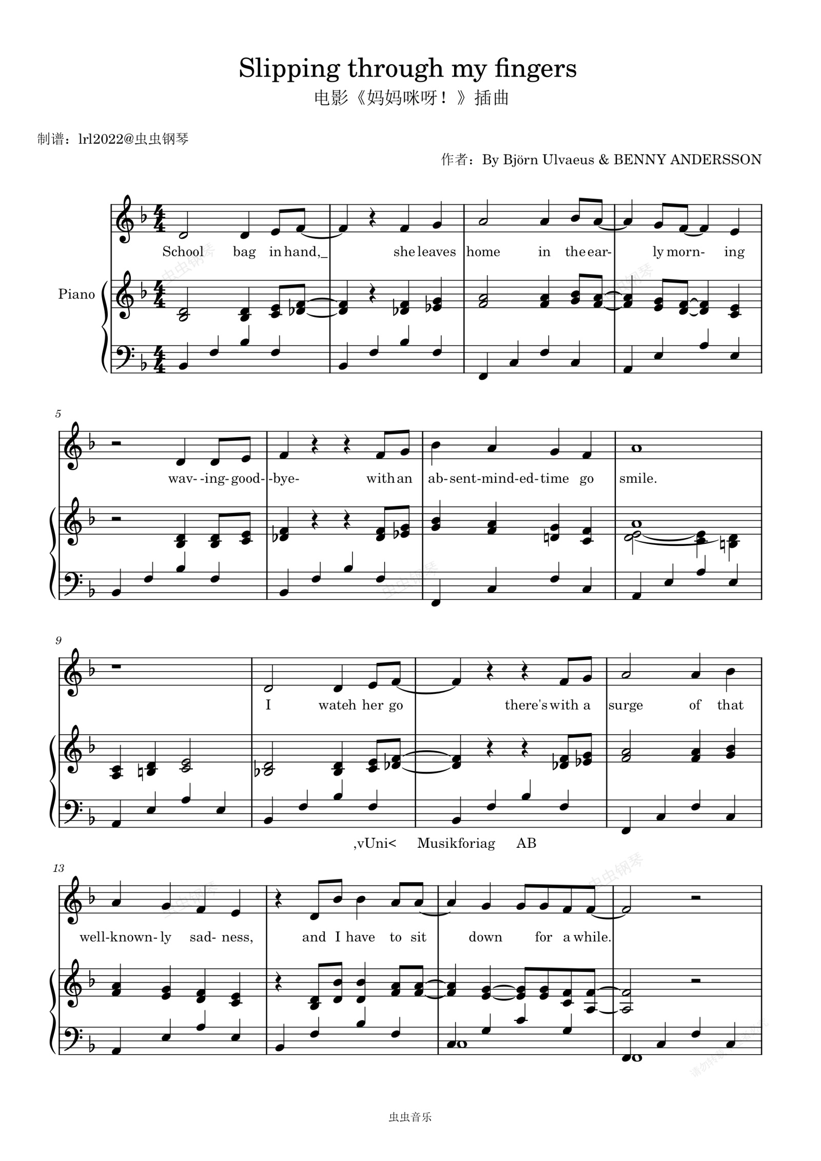 钢琴谱:Slipping through my fingers - Mamma Mia! OST - 电影《妈妈咪呀!》插曲 - 钢琴独奏及歌词