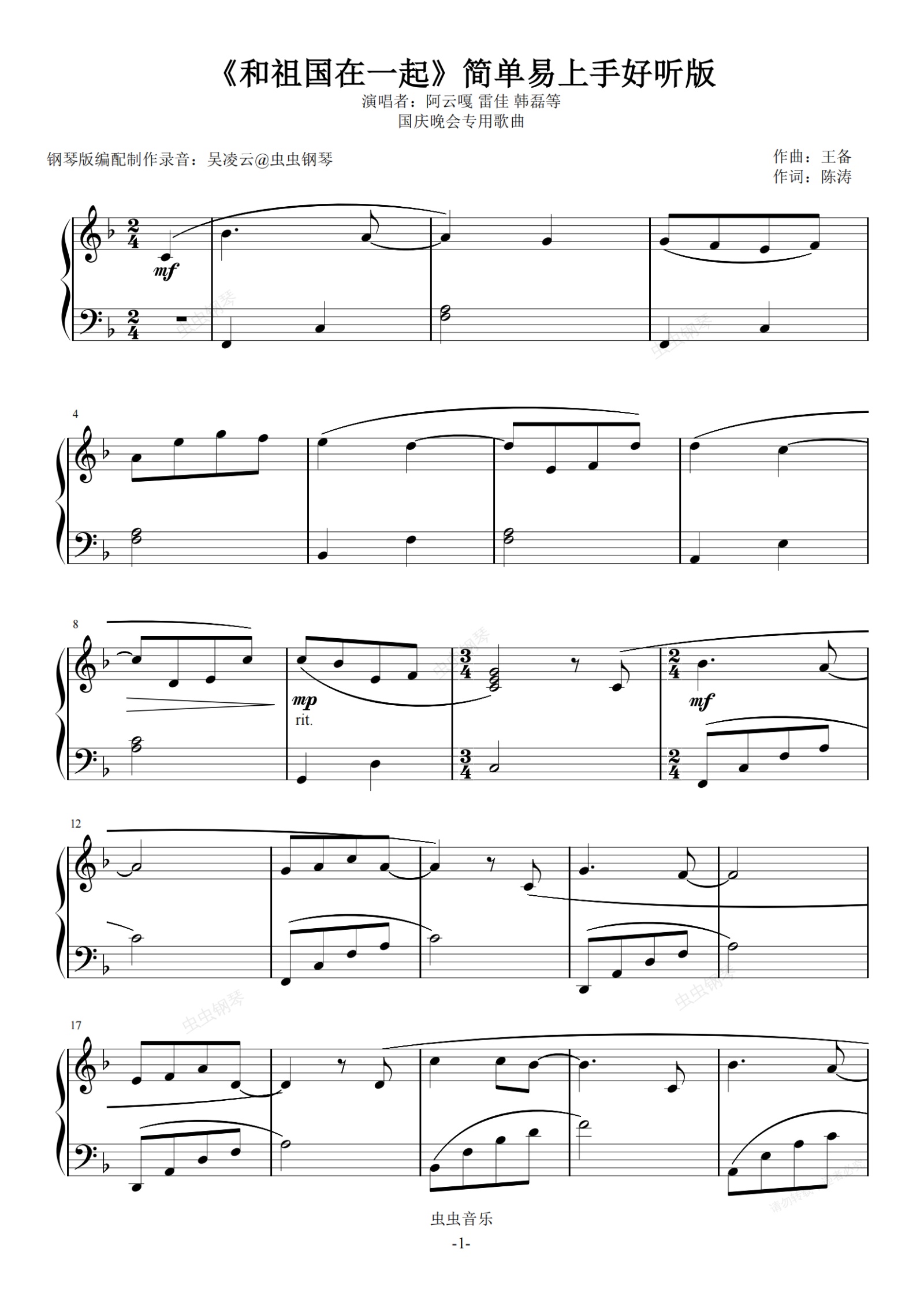 钢琴谱:和祖国在一起 简单易上手好听版 阿云嘎 雷佳 韩磊等 国庆晚会专用歌曲
