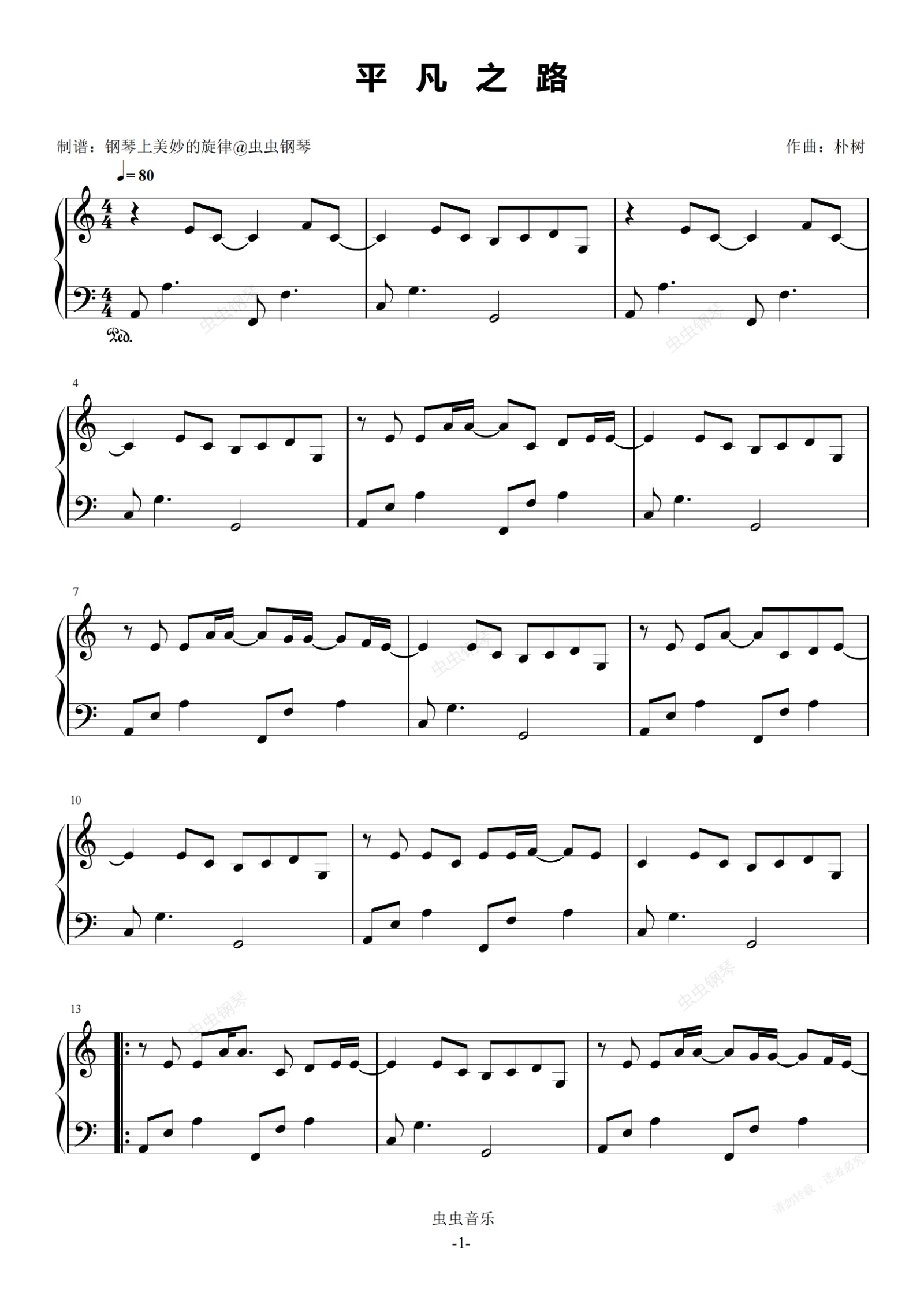 钢琴谱:平凡之路  C调简易版  朴树