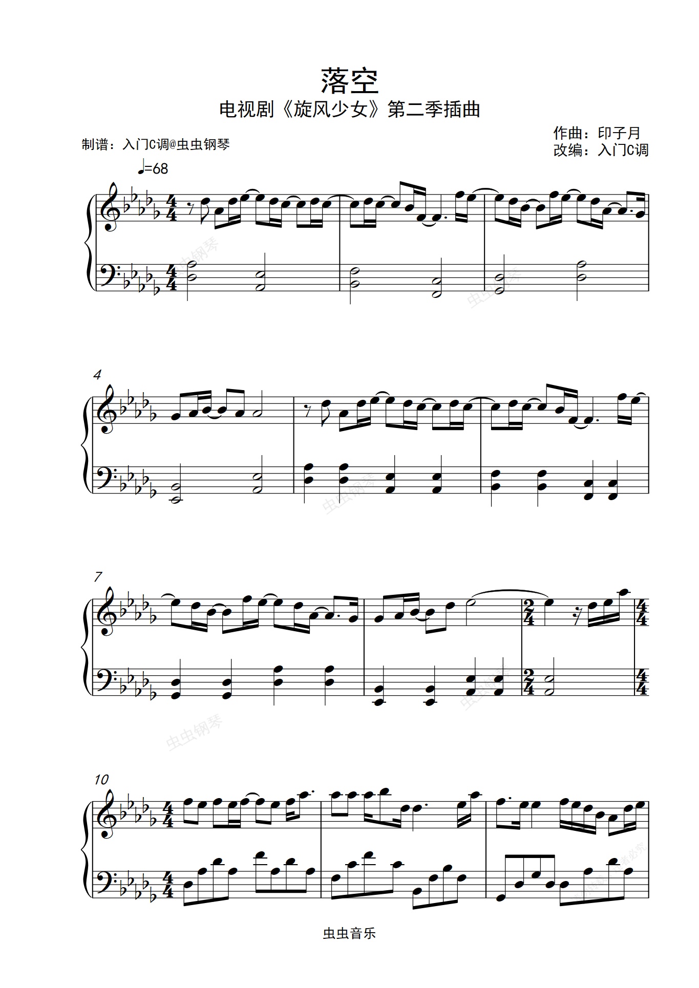 钢琴谱:印子月《落空》(《旋风少女》第二季插曲)原调简单版