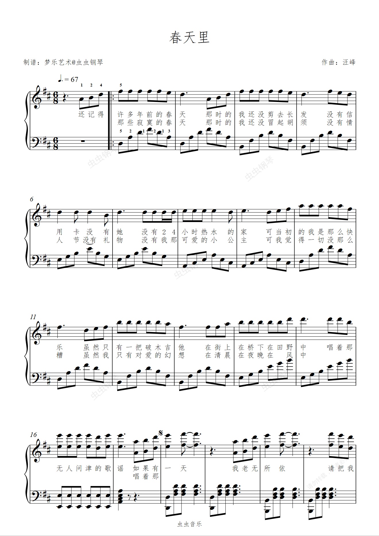 钢琴谱:春天里 原调D/附歌词指法 汪峰