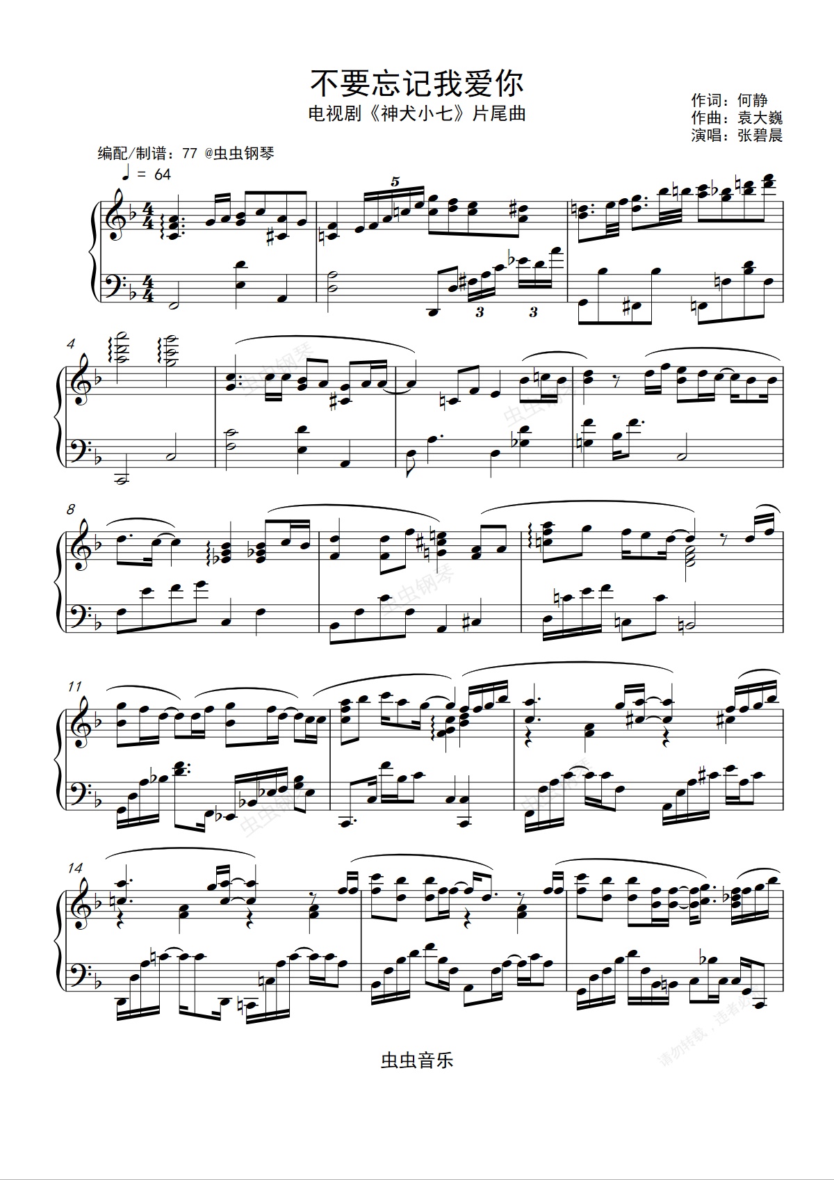 钢琴谱:张碧晨-《不要忘记我爱你》原调钢琴独奏谱