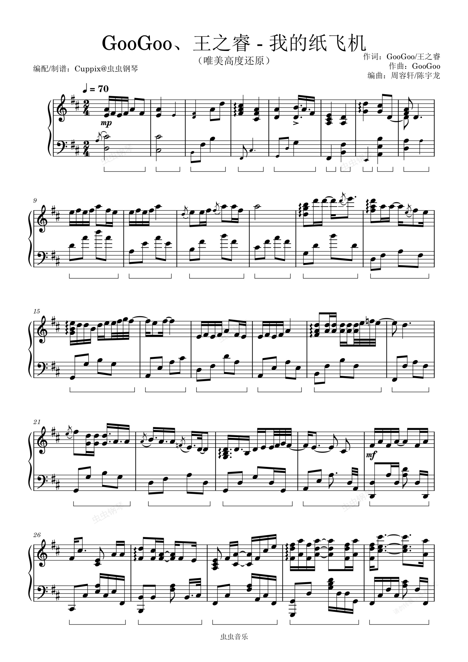 钢琴谱:《我的纸飞机》超唯美钢琴改编(GooGoo、王之睿)