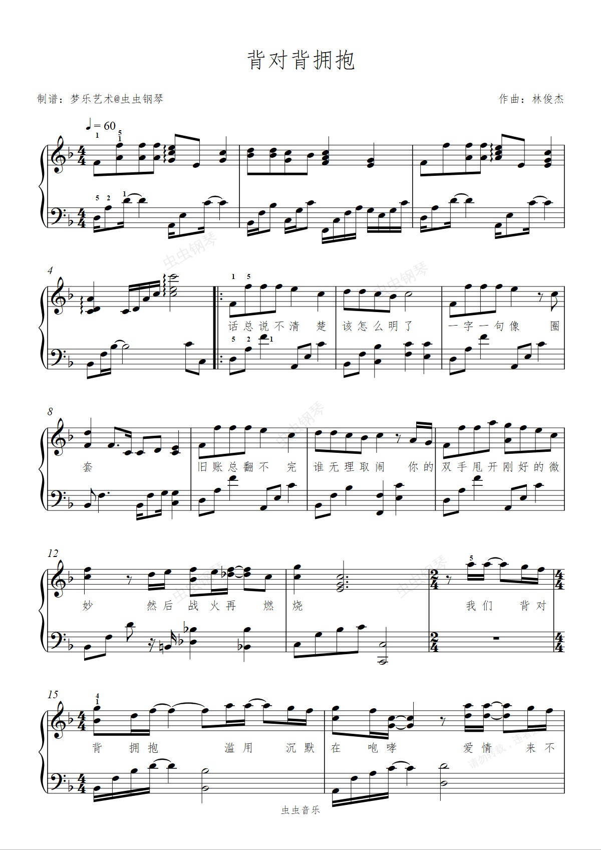 钢琴谱:背对背拥抱 原调F/附歌词指法 林俊杰