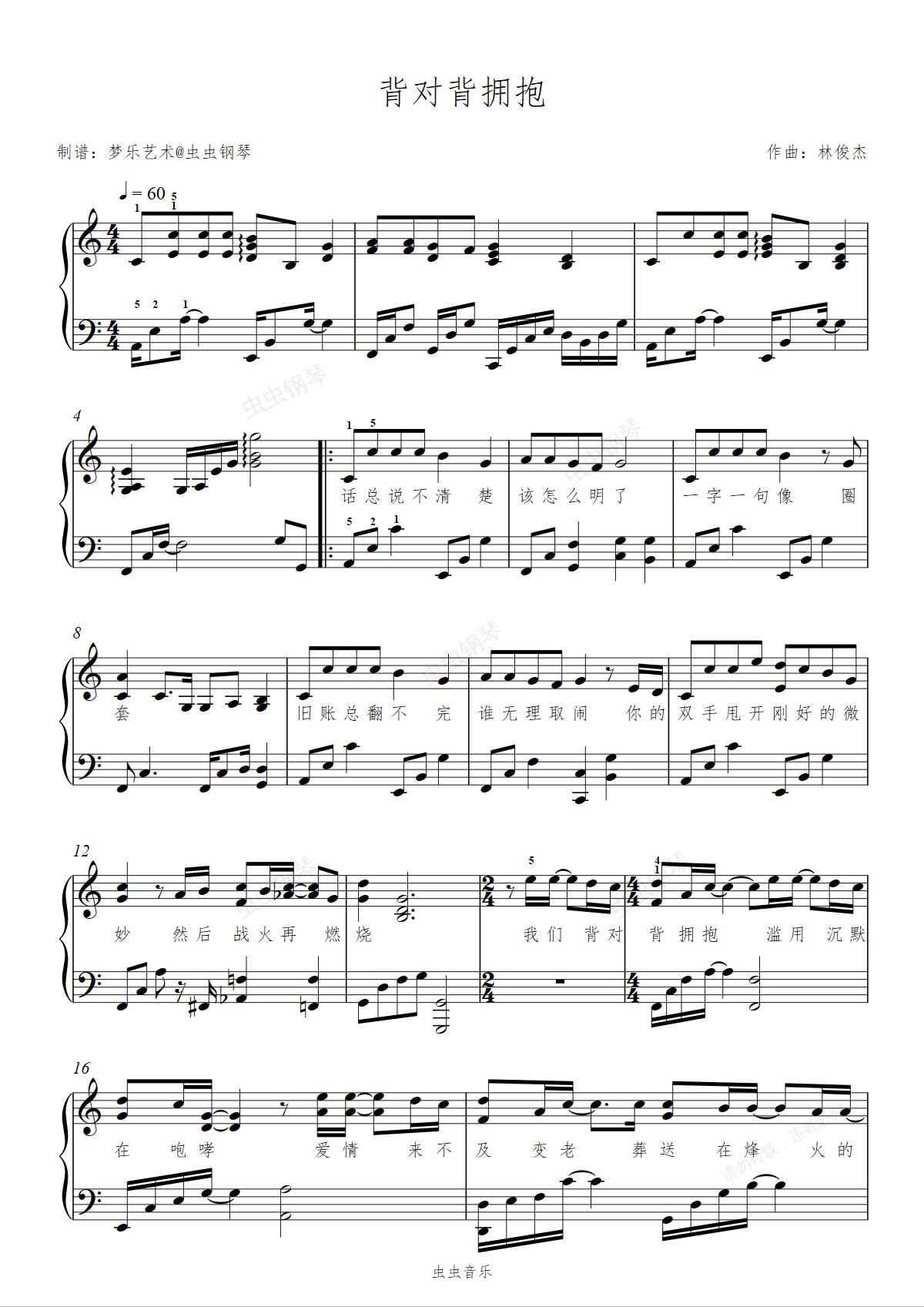钢琴谱:背对背拥抱 C嗲/附歌词指法 林俊杰