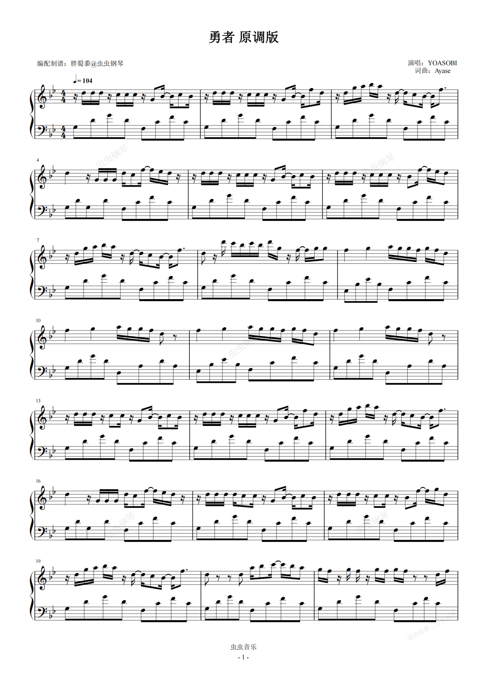 钢琴谱:YOASOBI-勇者(葬送的芙莉莲OP)原调完整版